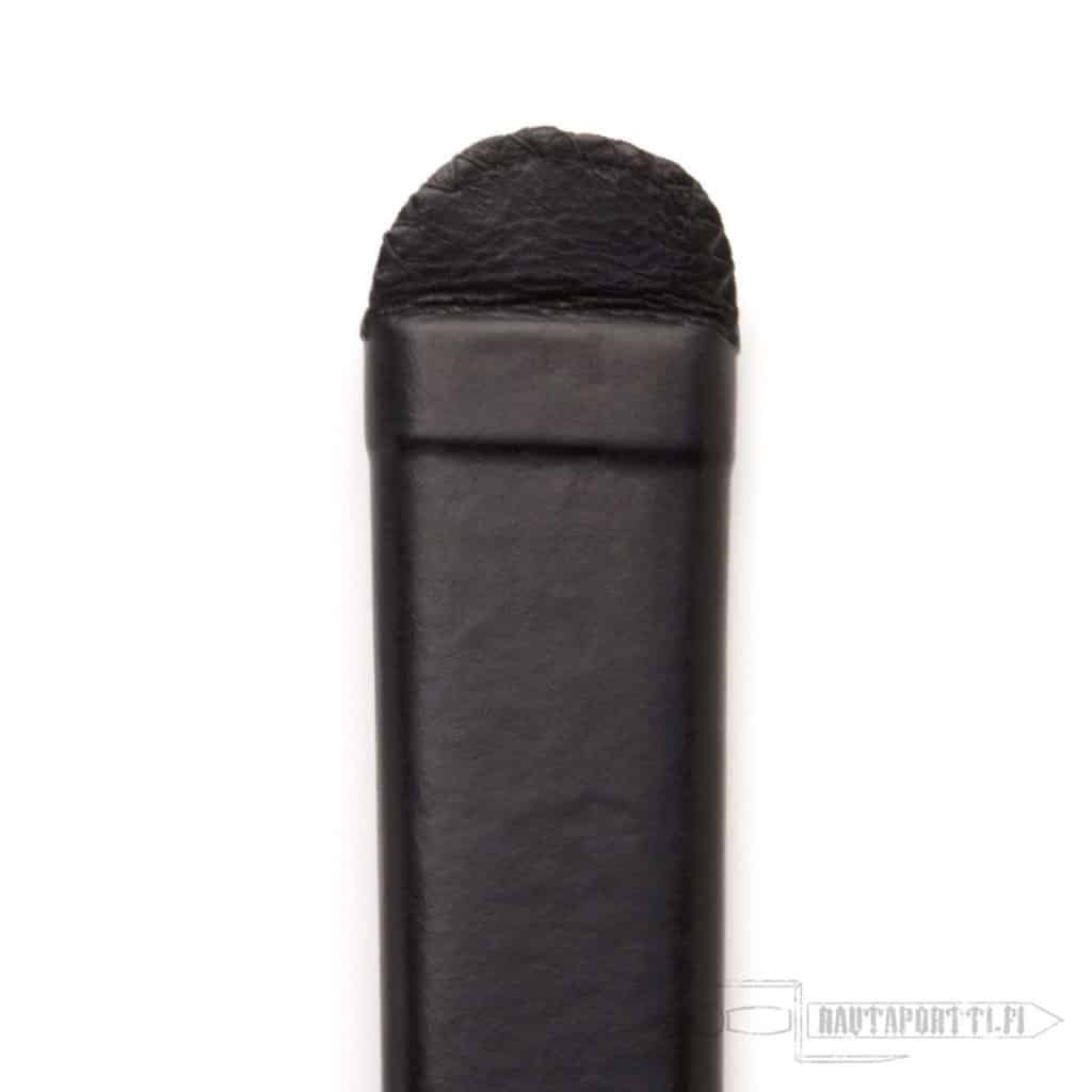 The sheath is made with a wood body and covered with leather. The tip is reinforced with a brass chape. At the throat, the leather extends upward and covers part of the guard at the ricasso.