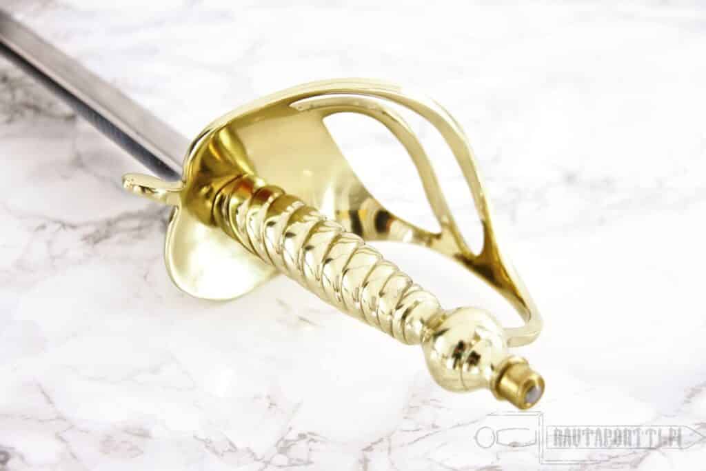 This replica has a tough, hand forged, tempered high carbon steel blade and a solid brass heart shaped guard characteristic of the period. Leather scabbard with brass throat and tip. Made by Windlass Steelcrafts with the same care and attention to detail lavished onto the swords crafted for government defense contracts all over the world.