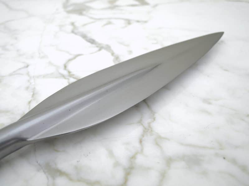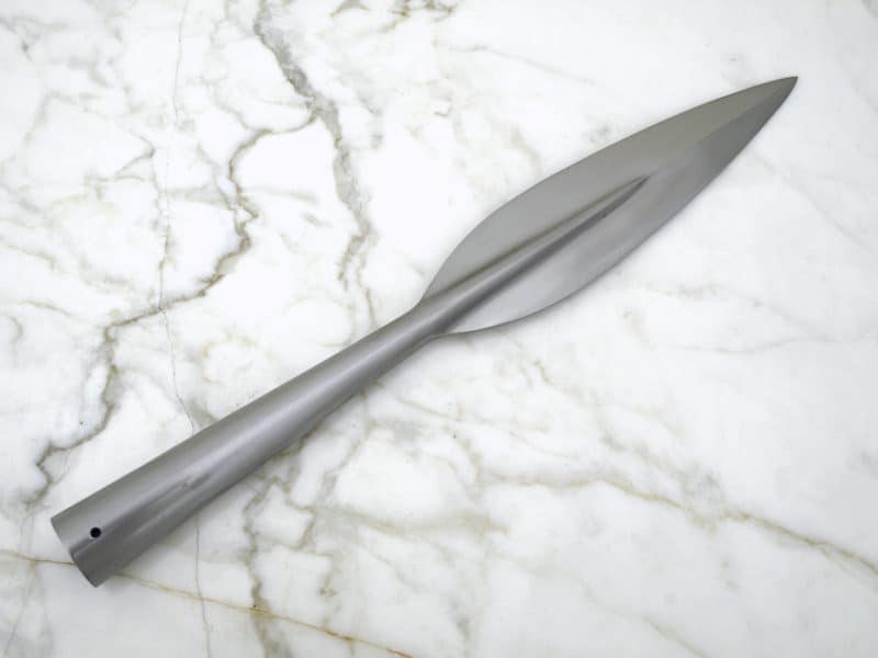 One of the world’s most ancient weapons, the spear was a dominant presence on the field of battle for an amazingly long period of time. This particular blade form was put to use during a wide range of European history by a wide range of cultures, from Ancient Celts and Greeks to well through the Renaissance. The blade is tempered steel and the socket fits a 30mm (1 1⁄5″) round pole (not included). Use with our round ended butt cap or flat ended butt cap.