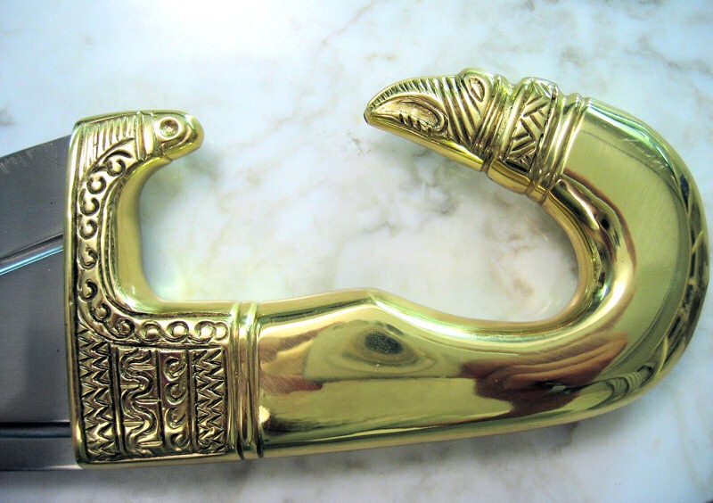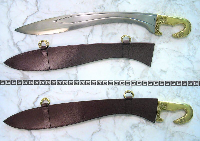 Circa 200 BCE. The Celt-Iberians of Roman times were justly famed for their weapons, such as the Falcata; one of the most devastating swords ever made! The inward curving blade delivered a tremendous blow and could split both shield and helmet. Considered to be of Greek, or possibly Etruscan origin, this sword spread into Southern Russia and also Spain. It was in Spanish hands that it was most feared by the Romans. The blade is made from high carbon steel. The handle is solid brass. Comes with leather scabbard.
