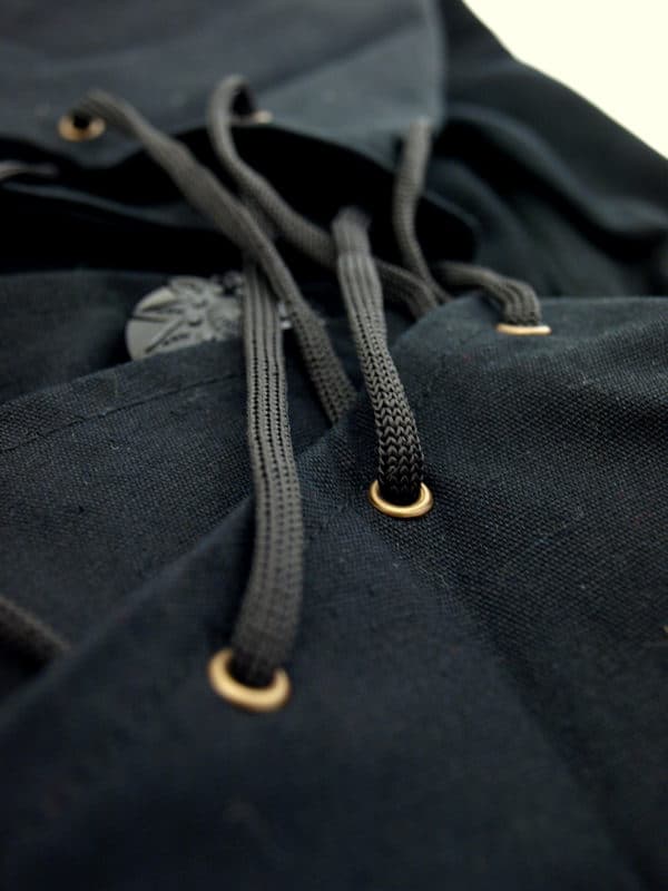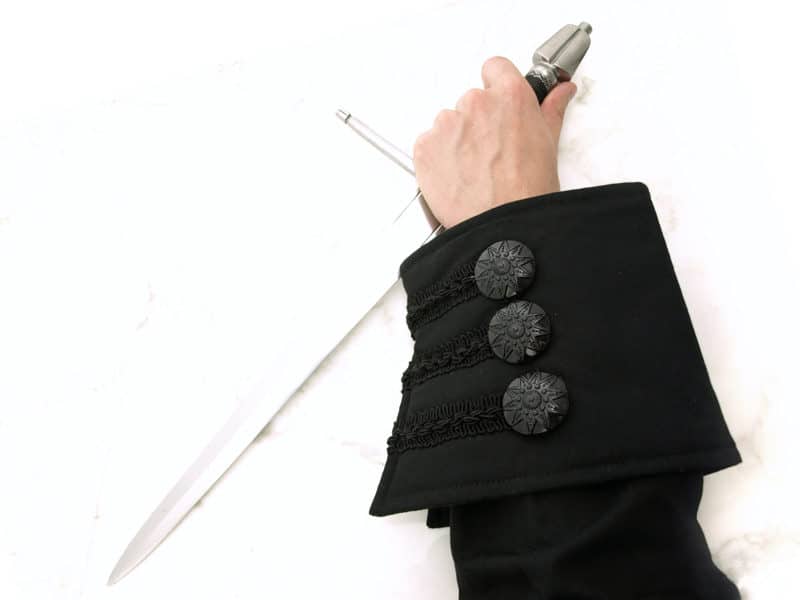 The coat has an elegant laced double collar. Upper part of the collar can be worn up for disguise as well as left discreetly down when traveling. Double collars like this were also used on docs and ships to prevent water splashing on the face of wearer. This full length coat is made of durable black denim and has a generous split on the lower back and sides, for freedom of movement. A stylish wide period cuff with braid and buttons adorn the sleeves. Two buttons on the back allow adjusting the waist according to the wearer.