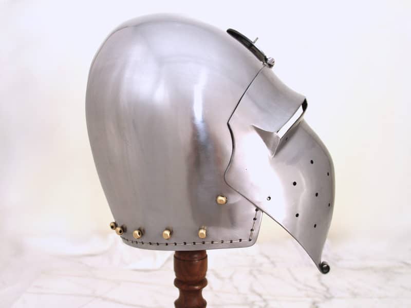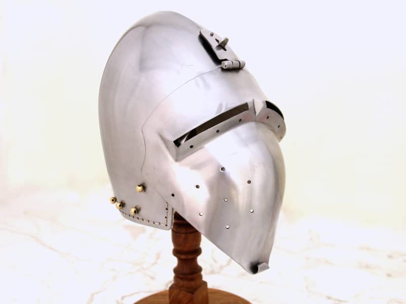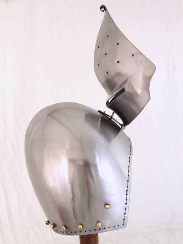 This is a reconstruction following an original from approx. 1370 CE. The original is displayed in the Valeria Museum, Sitten, Swizerland. This type of helmet evolved from the skull cap or cervelliere during the early 14th century. It’s visor is attached with a hinge at the front center and is removable. It is therefore often called “klappvisor bascinet”.