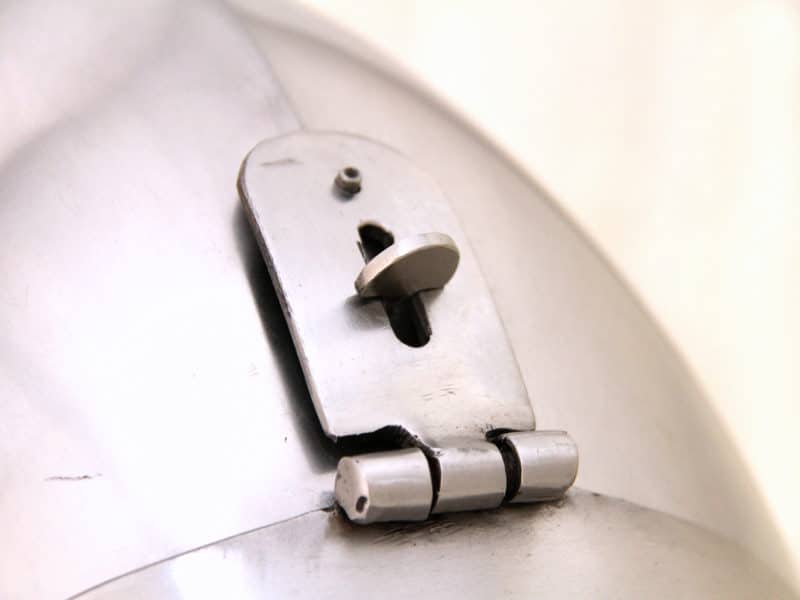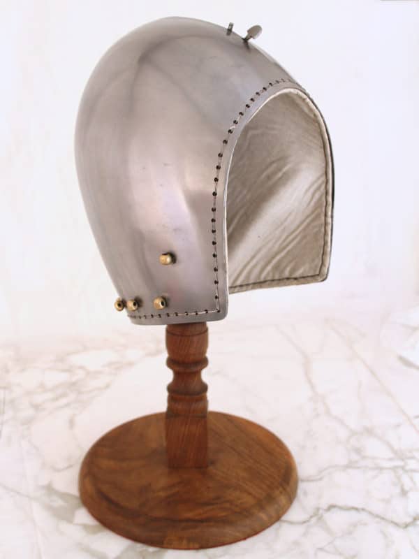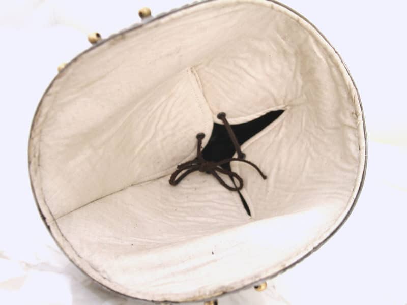 This helmet is handmade from 2 mm (1/13”) steel plate, riveted and welded. The fine workmanship insures high robustness and therefore best possible protection during battle reenactment. There is a comfortable, padded cloth liner. The brass rivets at the sides are for attachment of an aventail for chest and shoulders.