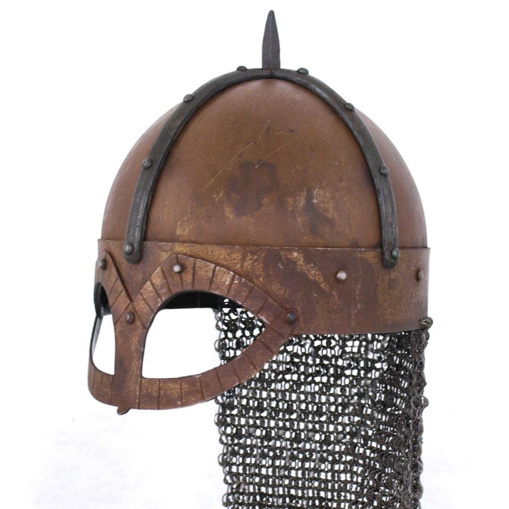 The original of this helmet was discovered in 1943 during an excavation of a rich viking burial mound at Gjermundbu, and is now displayed in the Historical Museum of the University of Oslo. The helmet has been dated to 970 AD, and it is currently the only viking helmet ever found to have survived intact to our day. The helmet consists of the spangen, or a horizontal rim and two vertical strips which together form the framework of the helmet, onto which the iron plates are riveted. The Gjermundbu is a typical example of a Viking spectical helmet, which offers the carrier good face protection while also guaranteeing an adequate field of vision. The helmet shares similarities with other preceding helmet designs, such as the Vendel helmets. These include the rounded cap, the spectacles, as well as the mail aventail.