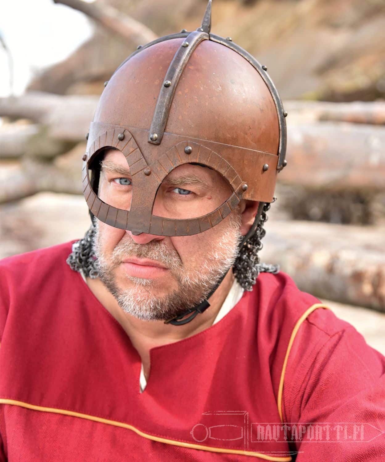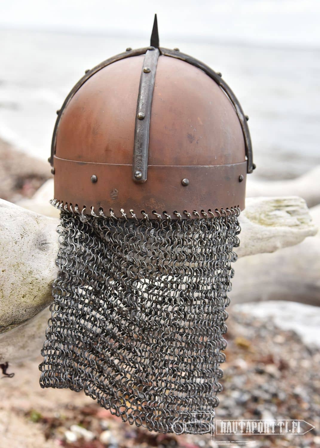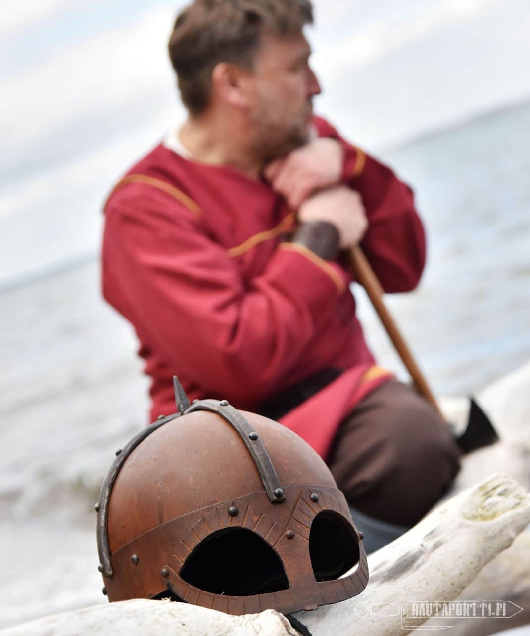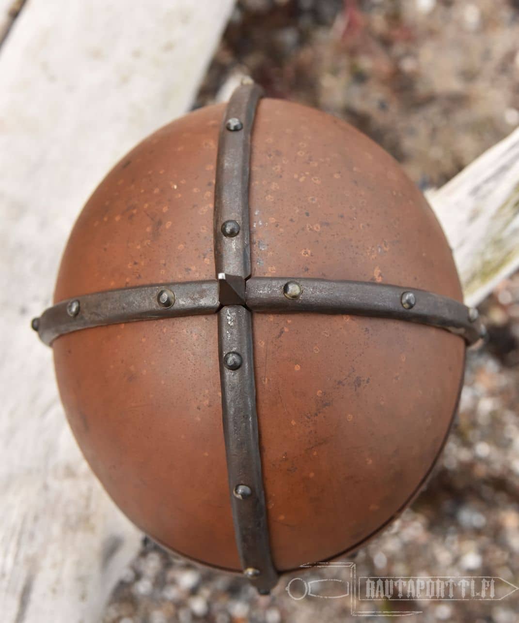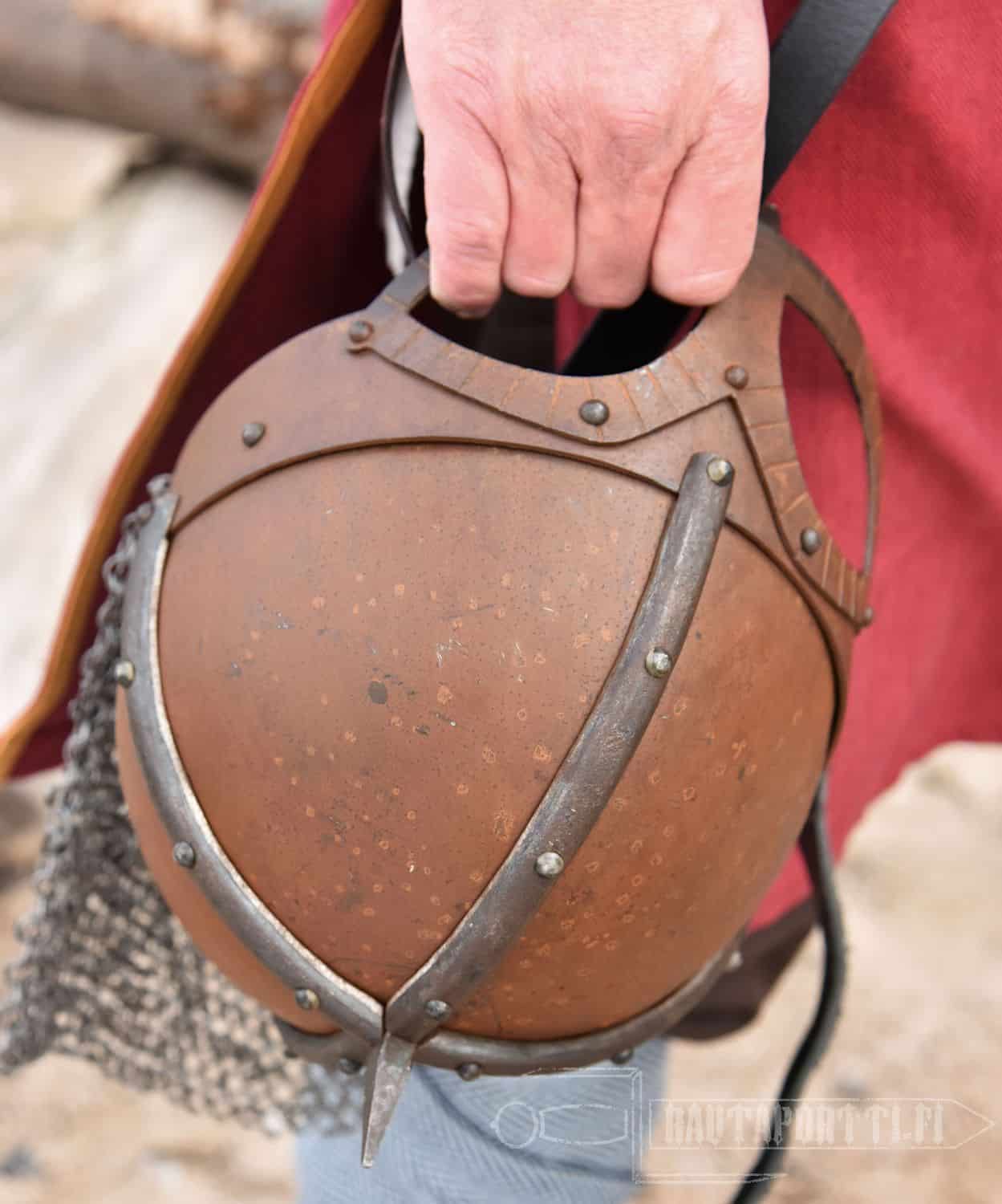 This Gjermundu helmet is made to look authentic, which is why it has deliberate “imperfections” and has not been polished to a high gloss. The patina on the surface emphasizes its authenticity. These helmets are individually hand-weathered and thus unique, and not copies of each other. There are deliberately manufactured markings of wear, tear and use to make the item seem more antique. Just like the whole surface is covered in rust, the scratches, stains and combat marks are designed as a part of this product to make it seem more like an authentic original, and are not considered defects.