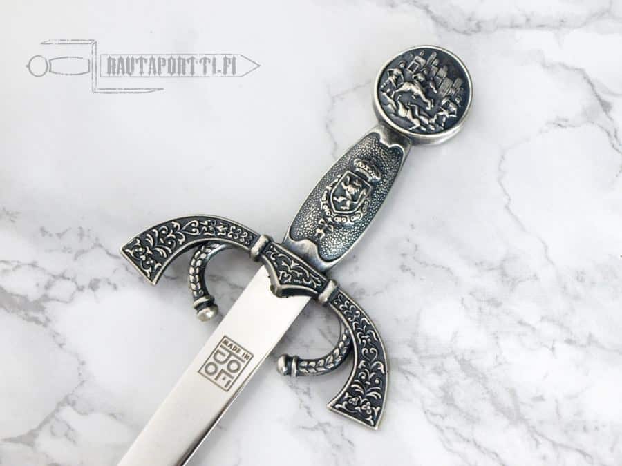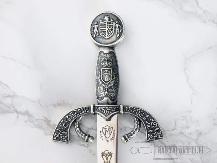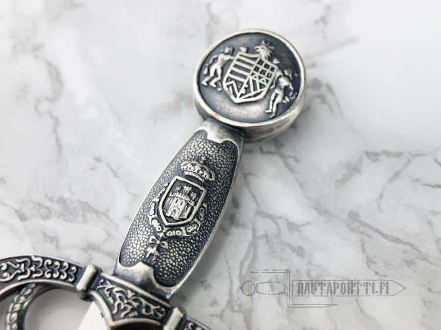 The original sword has been kept in Madrid in the Real Armeria and in its predecessor the Alcázar, since at least 1621. The details on this lavishly decorated sword show scenes from classic battles. Since the 1700’s, after the wars of Spanish succession and the arrival of the Bourbon dynasty, the sword has been used in the investiture of the Prince of Asturias (the crown prince of Spain) and in knighting the members of the Order of the Golden Fleece, one of the most prestigious knightly orders in Europe.