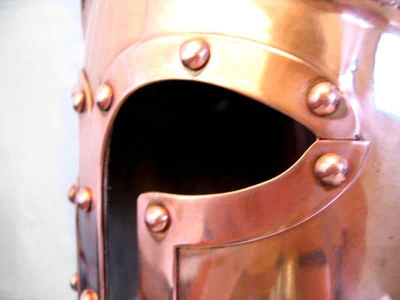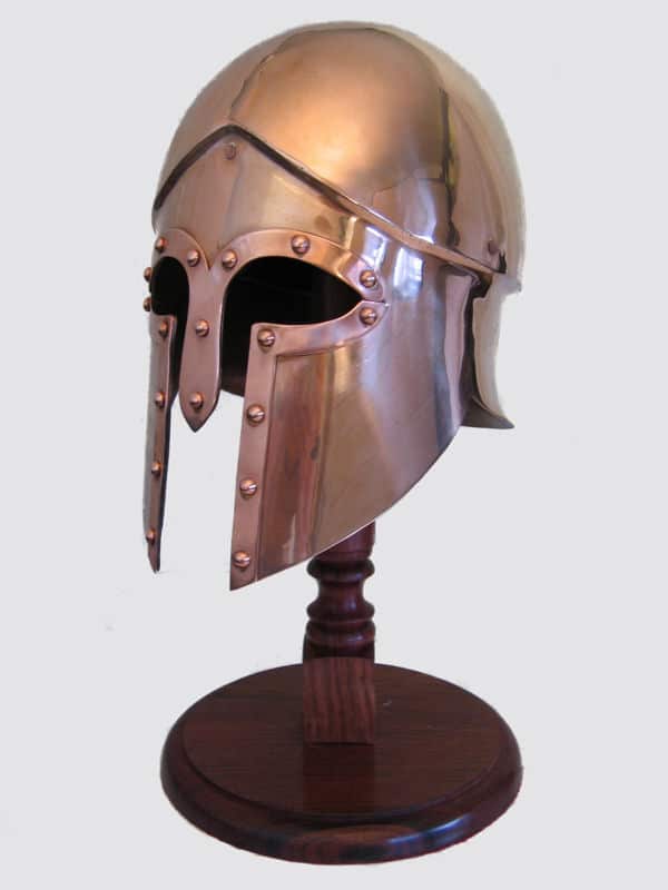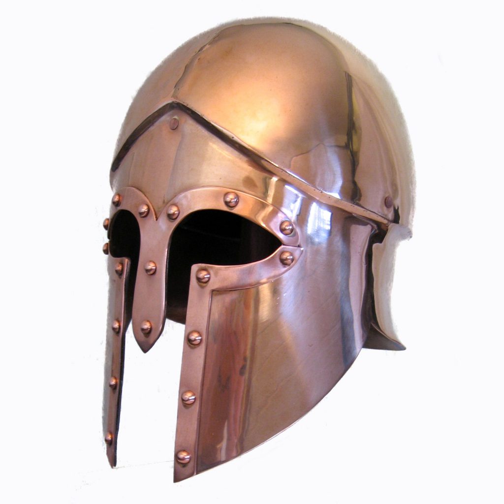 One of the most gorgeous helmets ever produced is the Greek Corinthian helmet. Although the Greeks used many other styles and types, this is the one most closely associated with the Greek Hoplite and Alexander the Great of Macedonia. As he had united the Greek city-states under his empire, eventually the Hoplites too were fighting alongside Alexander. Made of bronze, this helmet was designed to provide protection and visibility and also to allow the wearer plenty of air. The Corinthian helmet was used from the archaic period (600BCE) to the classical (300BCE). This clean, spare shape was the basis for many of the classical helmets of the Renaissance. We are pleased to offer this fully wearable copy that imitates the thin wall construction of the originals. Since bronze is heavier than steel, bronze helmets were made thinner than steel helmets to avoid excess weight. The main purpose was to deflect blows, rather than absorb them. A truly spectacular helmet, and one no collection of armor should be without. The height is adjustable with straps inside the helmet.