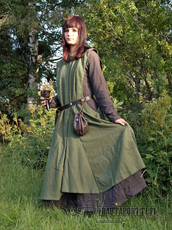 This sleeveless surcoat is based on original patterns, and has typically exaggerated large side openings. During medieval times the side opening grew bigger and bigger. The Pope and clergy started calling these side openings as windows of hell fearing that the womanly shapes on display would tempt men on a road of temptation and ruination. The funny term stuck and still remembered. This dress has been left unadorned so as to keep it historically accurate for a long time period.
