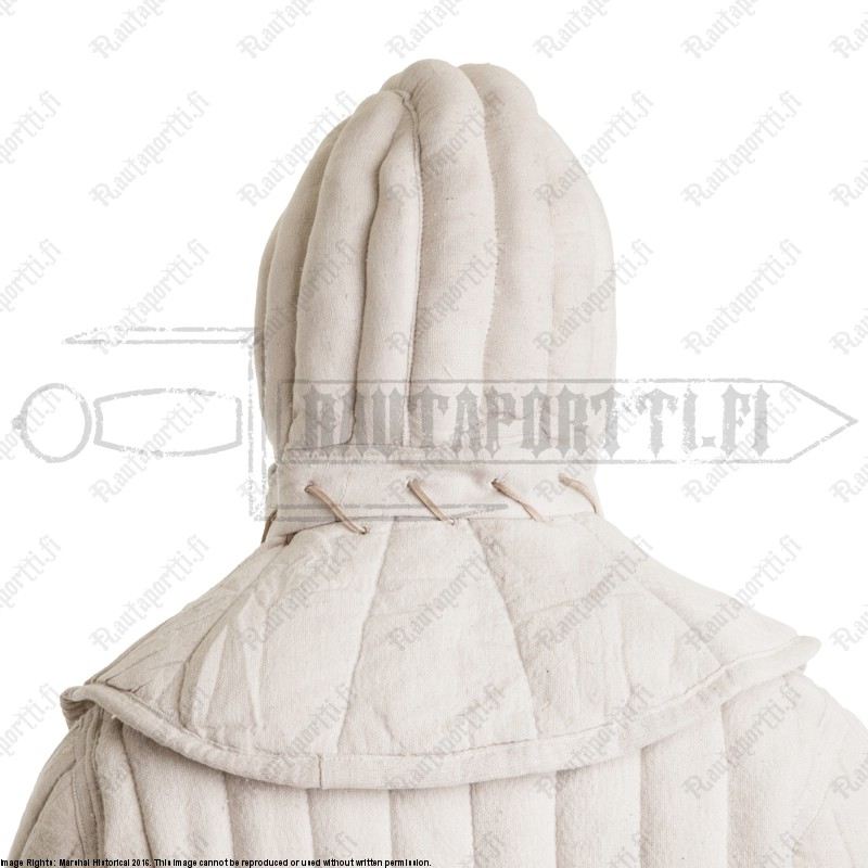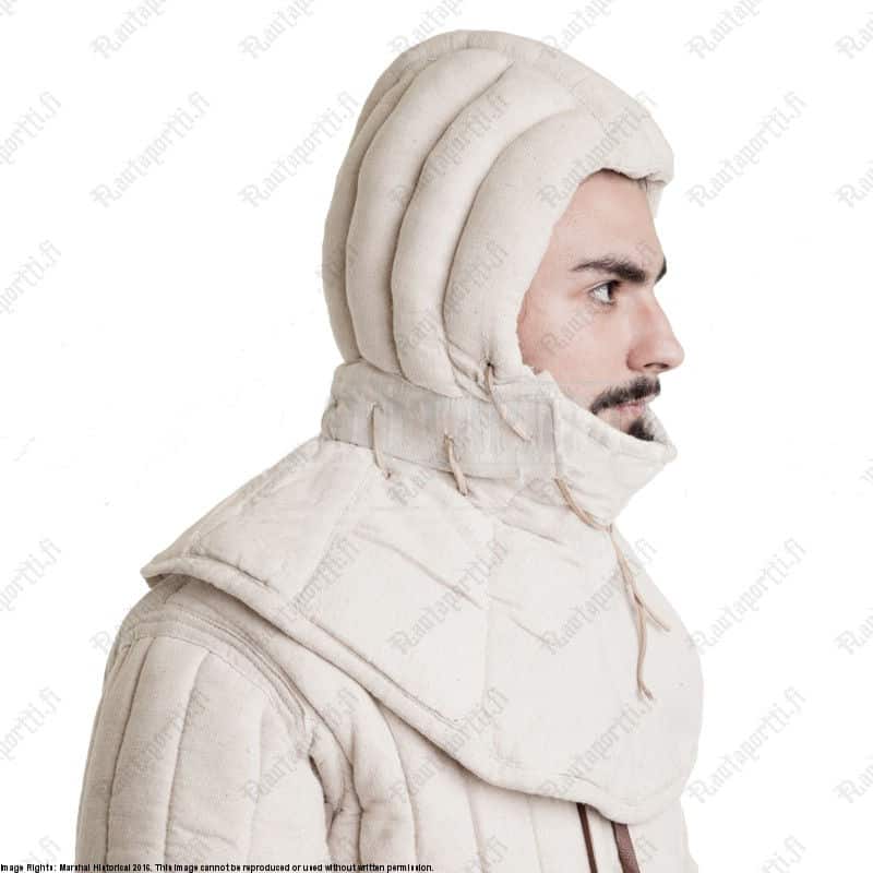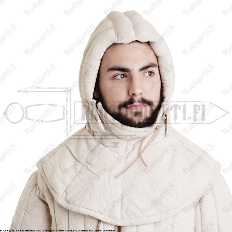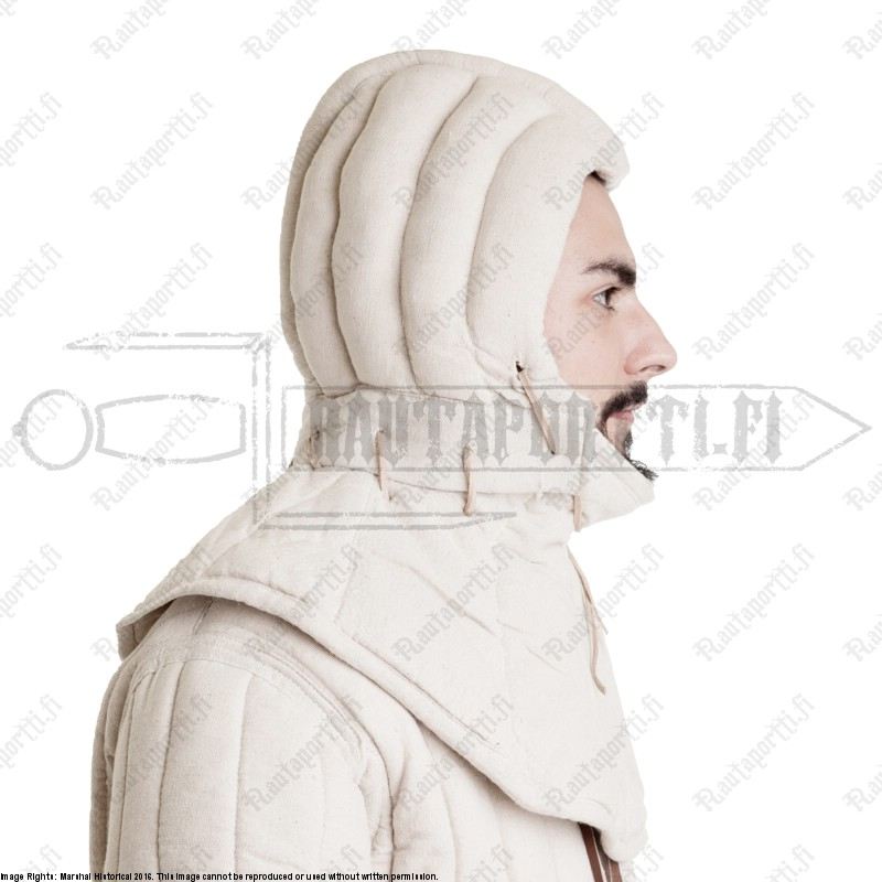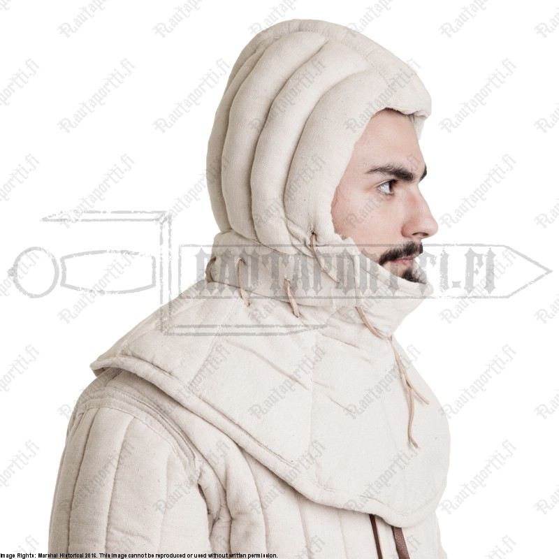 All knights and men-at-arms wore a padded coif for comfort and to soften the inevitable blows. This coif is the perfect addition to any garb and can also be worn on its own. The large collar gives extra protection for the throat, neck and shoulder areas, and is especially useful with helmets that come to the shoulders, such as bascinets. Made of heavy natural white cotton fabric, this hood can be worn with the larger helmets or under mail.