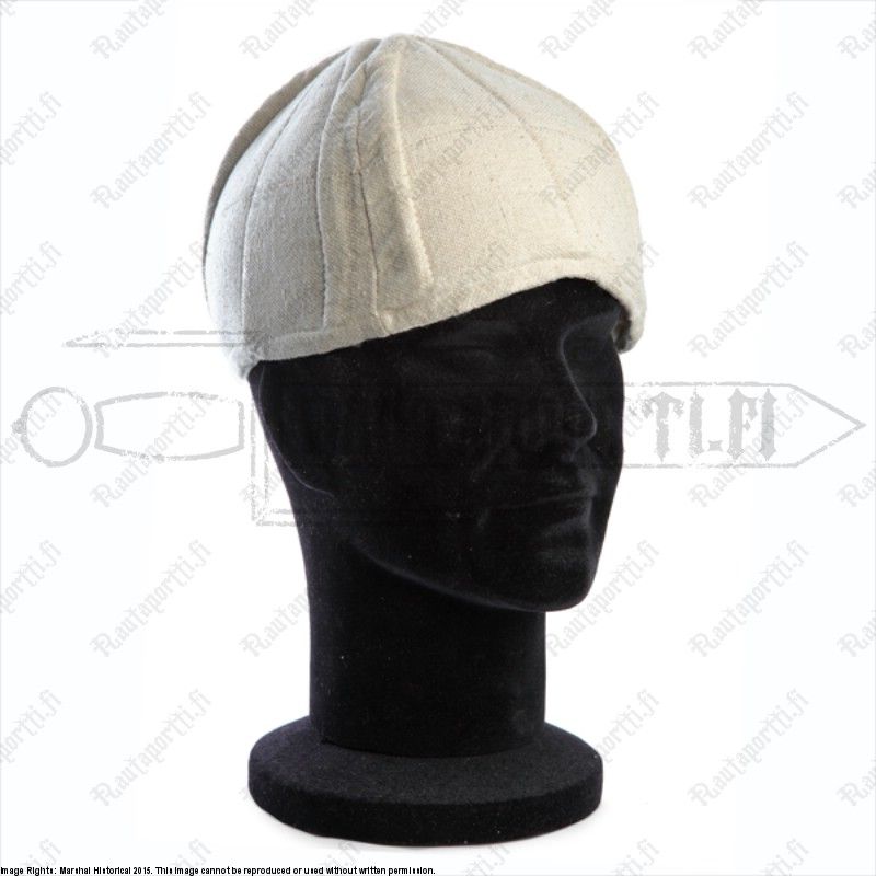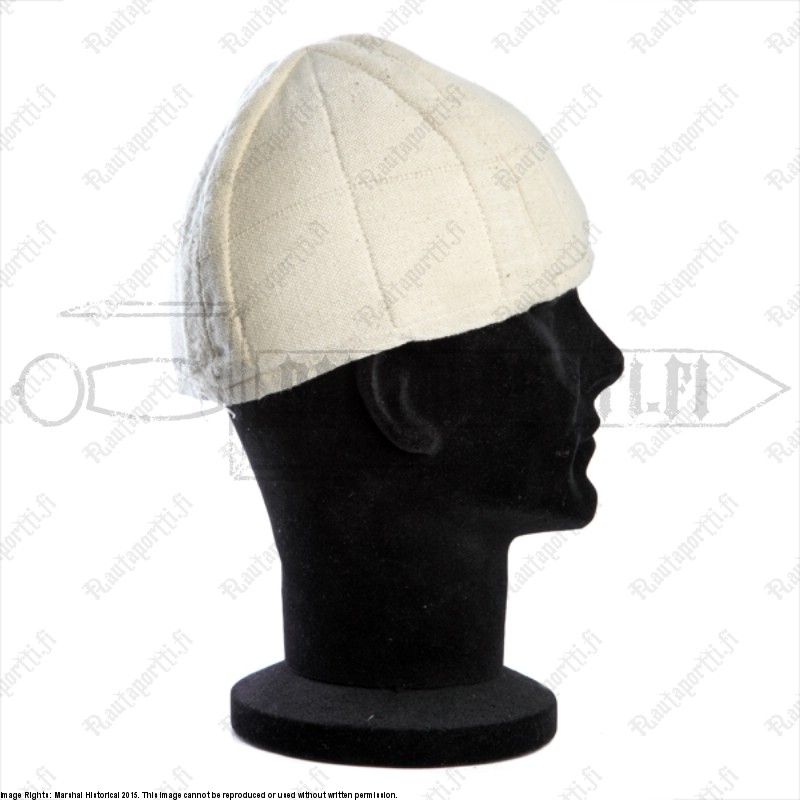 This item can be used underneath helmets or mail coifs for some extra protection to the wearer. Also if your helmet is a bit too large you can easily adjust the helmet to fit better just by adding this quilted cap inside.