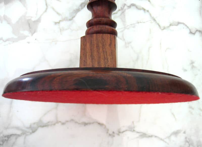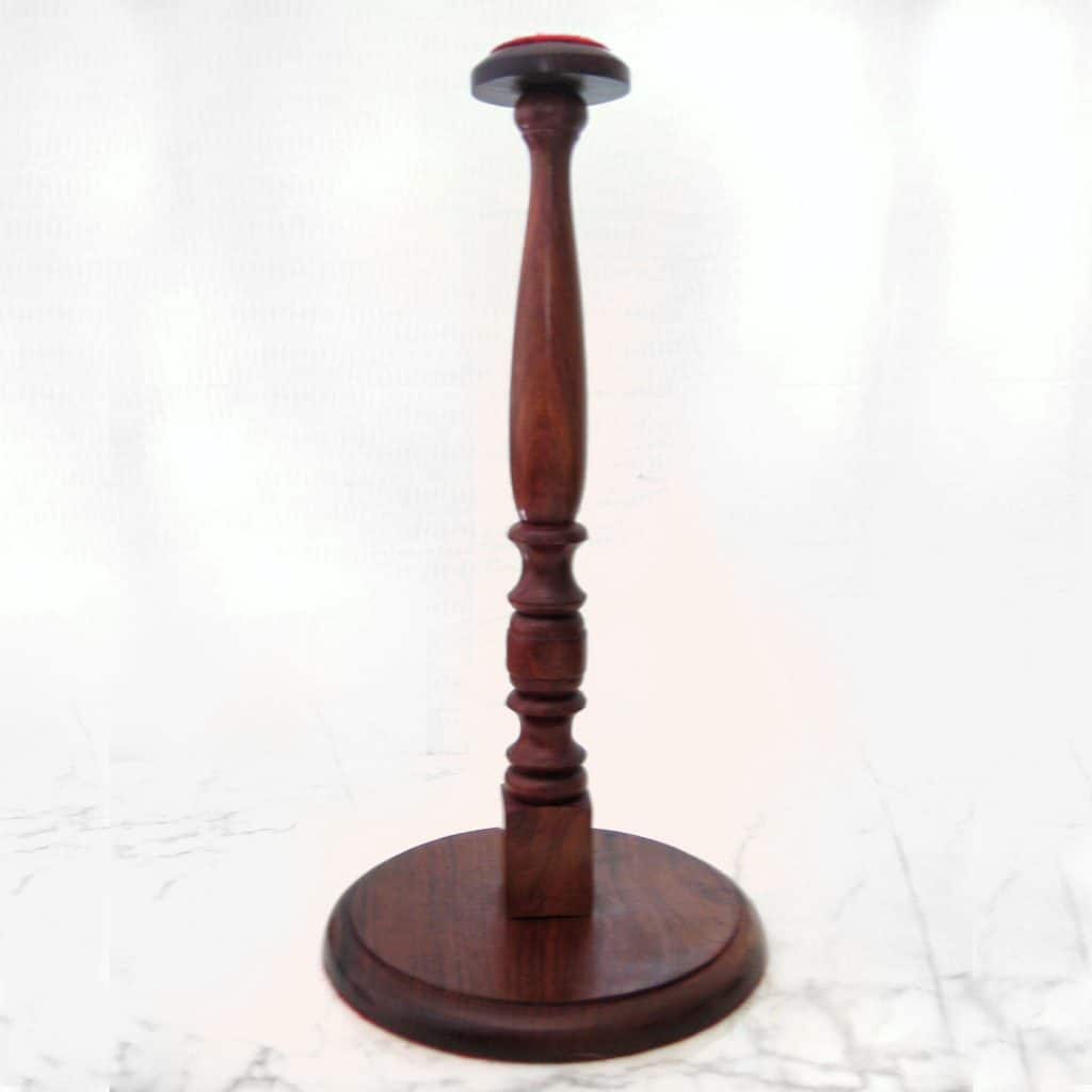 This hardwood helmet stand provides a stately and elegant way to display your favorite helmet on your bookshelf, work desk or cabinetry. It handsomely accommodates any size helmet from Roman to Great Helms. The beautifully turned hardwood post is stained and has a sturdy round, beveled base. The stand comes unassembled.