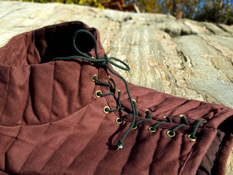 This heavy-duty gambeson was worn by knights and men-at-arms alike. The heavy quilted 100 % cotton body makes it a great addition over a shirt of mail. The lacing up the one side along the torso and also the shoulder gives this garment a fitted look and can be fitted even over a thick layer of other armor, while the high collar adds the needed extra protection. Does not include arms, vest only. Pictured with a shirt from the Robin of Locksley gambeson.