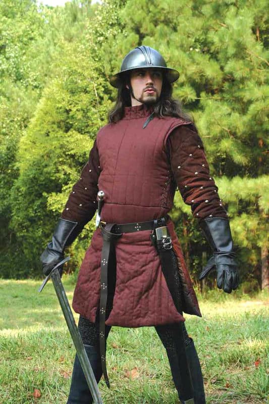The gambeson, or aketon as it is also called, would shield from crushing blows and were typically used underneath mail or plated armour, but also as an extra layer of protection on top of chainmail. This type of combination gave the soldier a good protection against many types of attack. As chainmail was expensive, gambeson was often the infantryman’s only piece of body-armor.