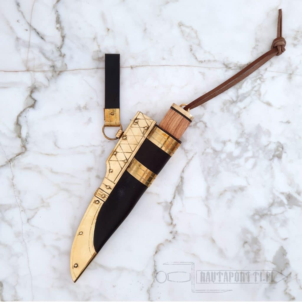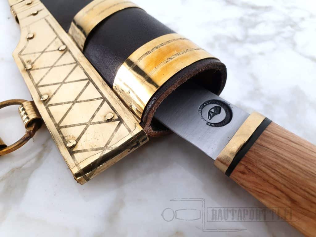 Brass decorated and enforced sheath was a way to show of your wealth during Scandinavian Iron Age. A good sturdy knife was something everybody carried with them everyday, whether working at home farm, in the woods, on a journey or feasting. A good knife was part of the everyday dress for men and women alike. Flashy brass or bronze decoration on you knife sheath was something that made it more durable but also showed to everyone around you that you have the means to get something extra besides just the basics for yourself. Brass decoration on your knife wasn’t just reserved for the wealthiest, it wasn’t luxury as we might think of it nowadays, but still something the poorest of the society wouldn’t spend their money on.