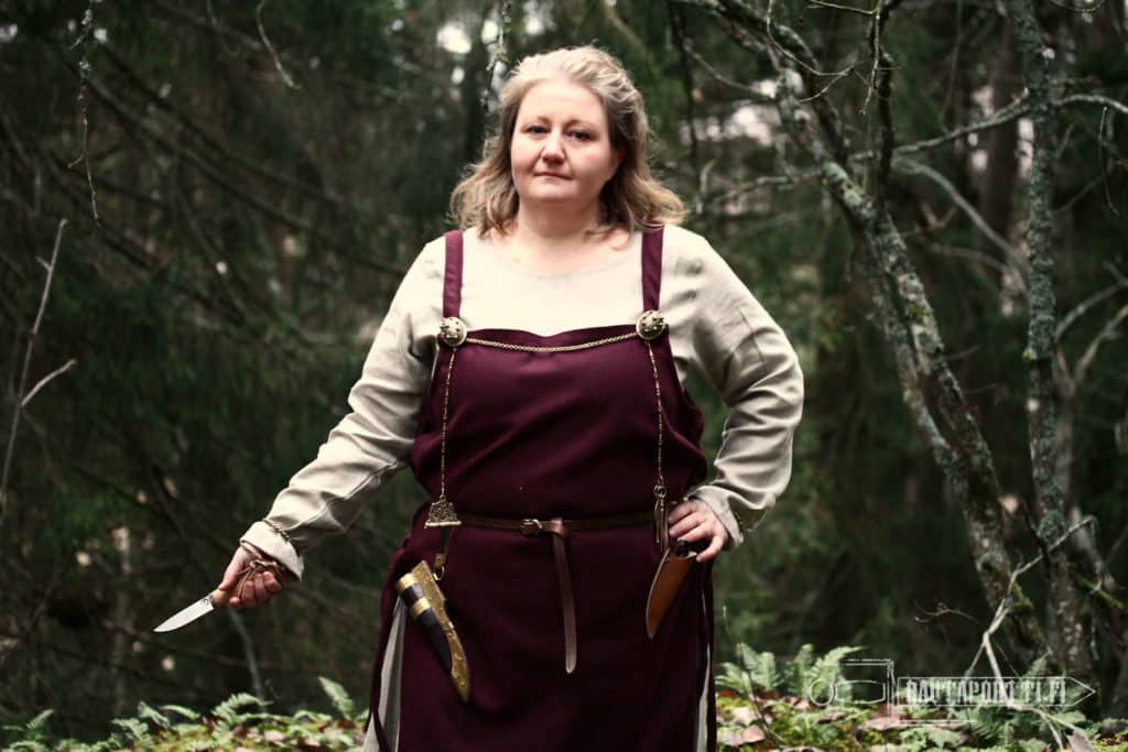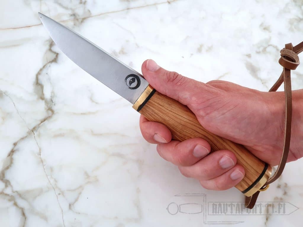 This is a good utility knife for all Vikings and other Iron Age Northern European people. Good size for chores, crafting and also self defense when needed. Several knives in this style have been found for example in heart of the Viking world Birka and Gotland. The durable and sturdy blade is hand forged out of 1095 Carbon Steel and the dark brown leather sheath has a belt loop for easy carrying.