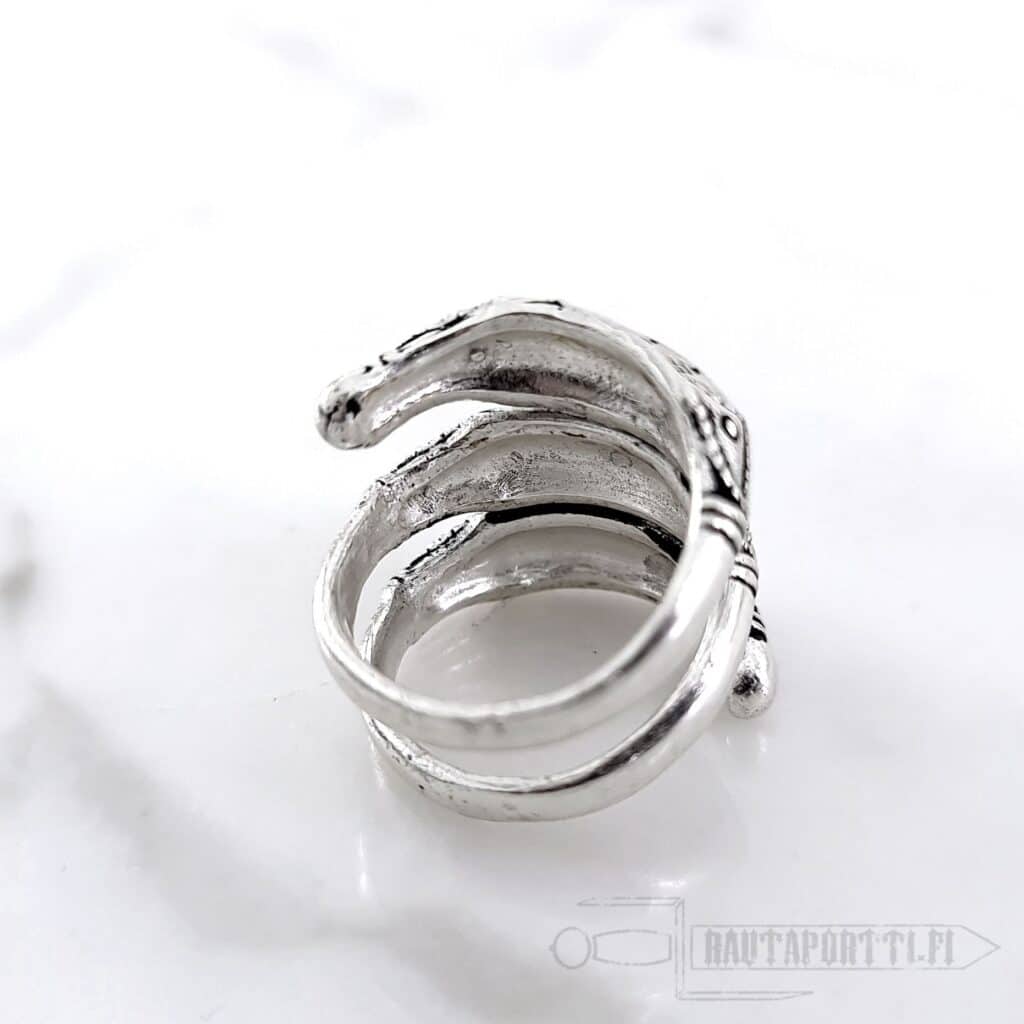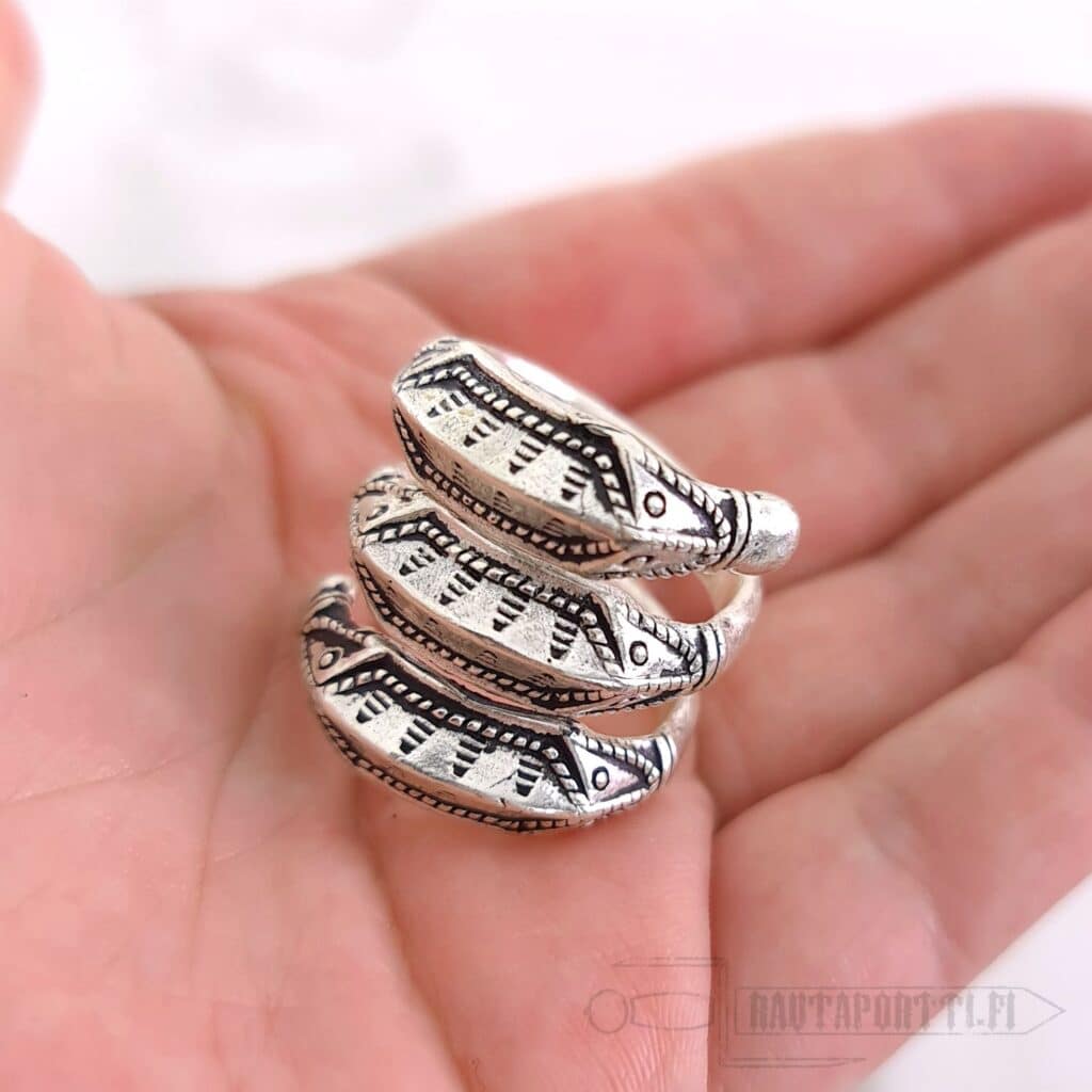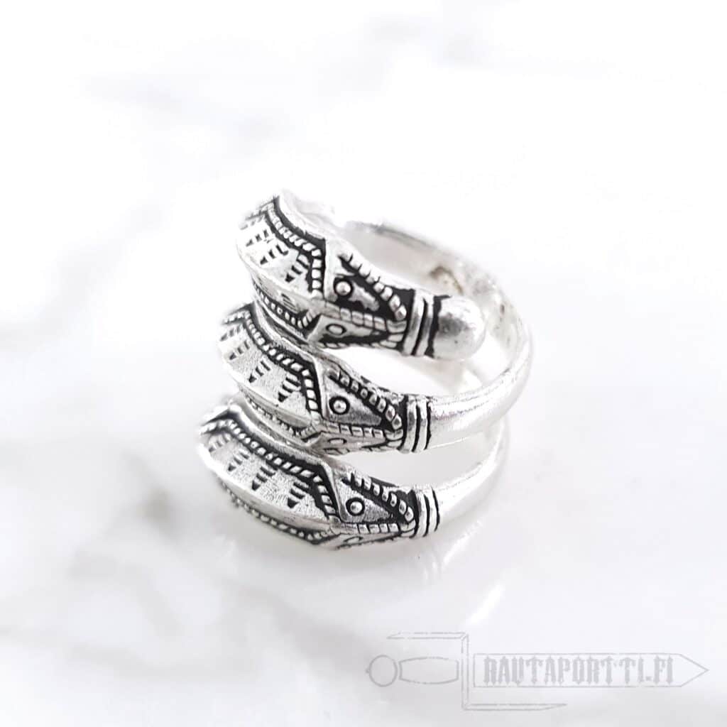 Iron Age ring with Germanic snake decorations Modeled after a ring found from Himlingøje, Denmark Plated with real silver Available in sizes; S, M and L Open ring allows small sizing adjustments The widest measure of the face of the ring is 2.5 cm Perfect accessory for historical reenactment, LARP or everyday life