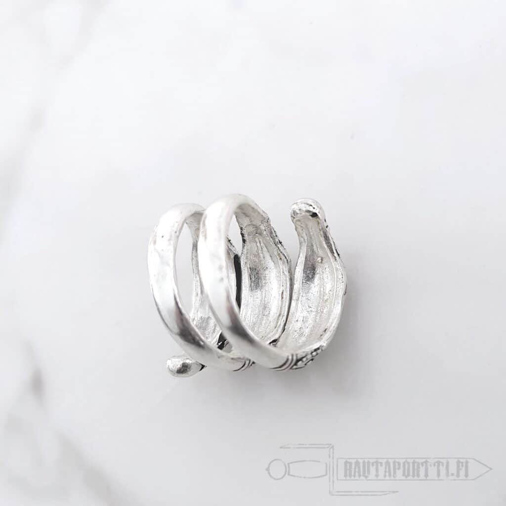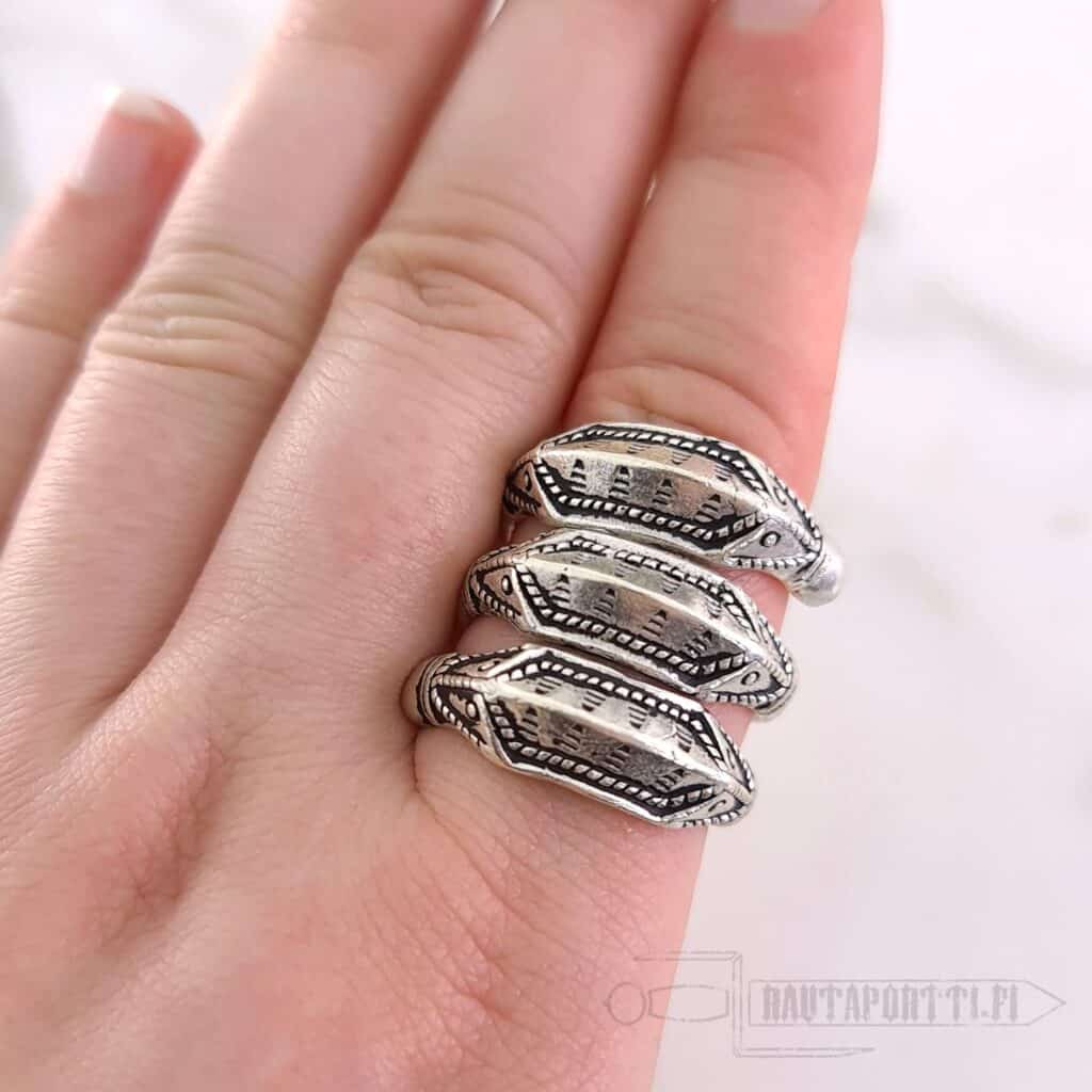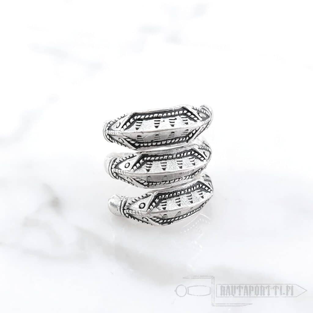 Iron Age ring with Germanic snake decorations Modeled after a ring found from Himlingøje, Denmark Plated with real silver Available in sizes; S, M and L Open ring allows small sizing adjustments The widest measure of the face of the ring is 2.5 cm Perfect accessory for historical reenactment, LARP or everyday life