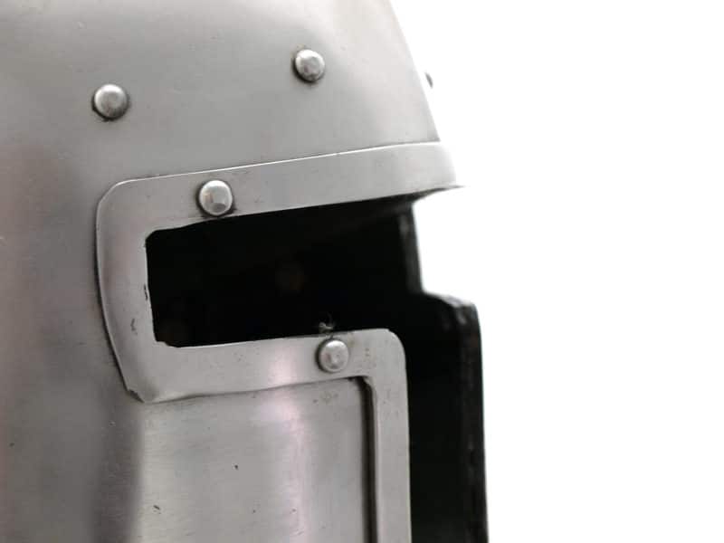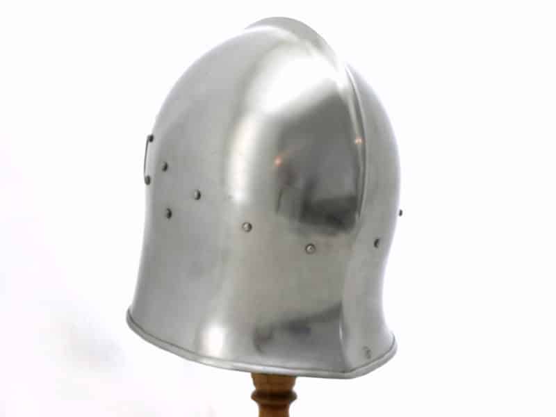 Barbute is a type of salade and was prevalent on the 14th and 15th centuries in northern Italy, but was also worn throughout Europe. Barbute gives good protection for the whole head, face and cheeks of the wearer but thanks to the T-shaped opening it doesn’t impair vision or breathing.
