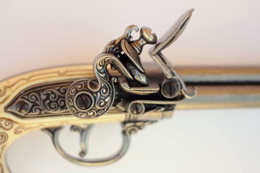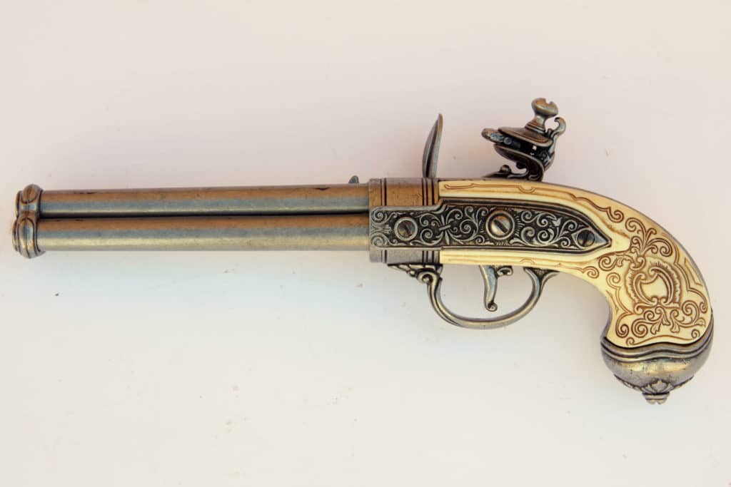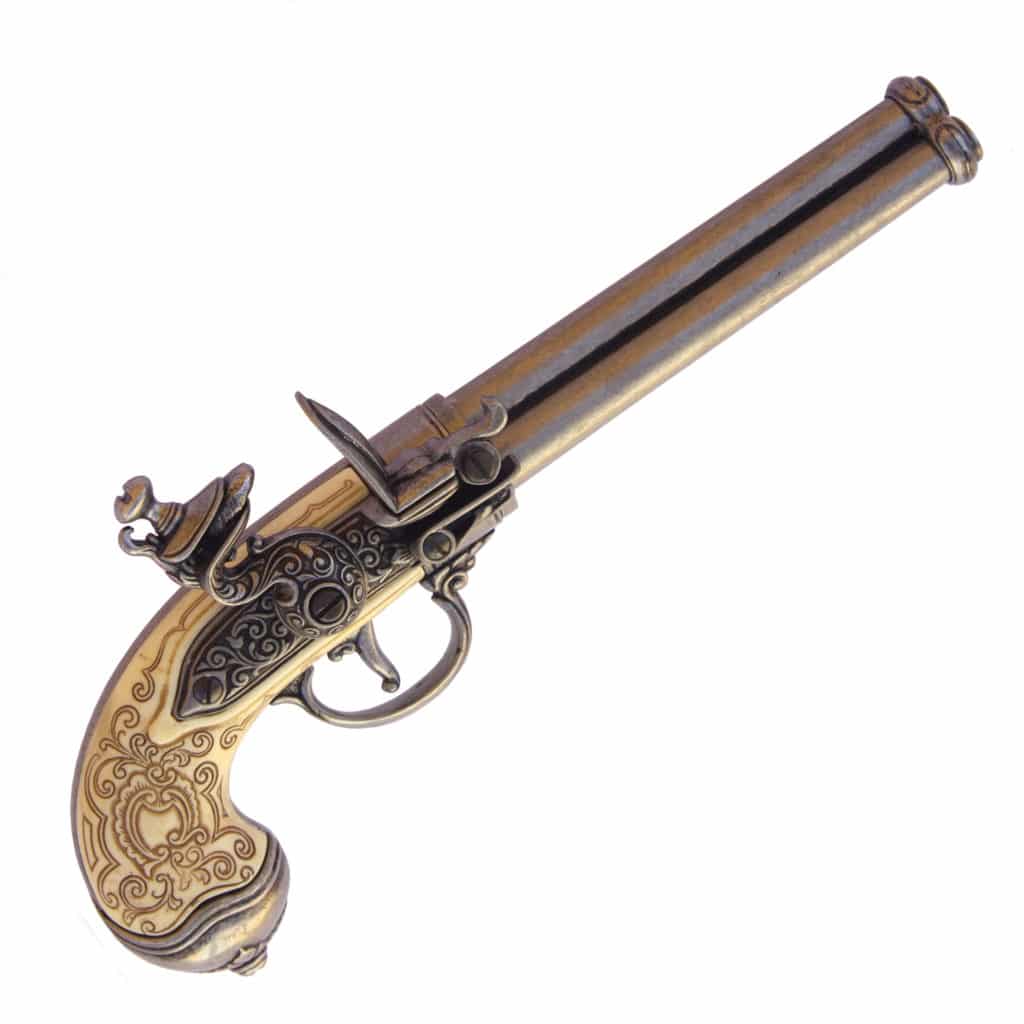 Three barrels and magnificently ornate carved ivory grips, the pistol truly was equal in splendor to the Medicis. The finely chiseled foliate scroll-work, heraldic escutcheon, and a faun’s mask on the butt in high relief, all make this a lovely piece of renaissance art. One original can be found at the Victoria & Albert Museum in London.