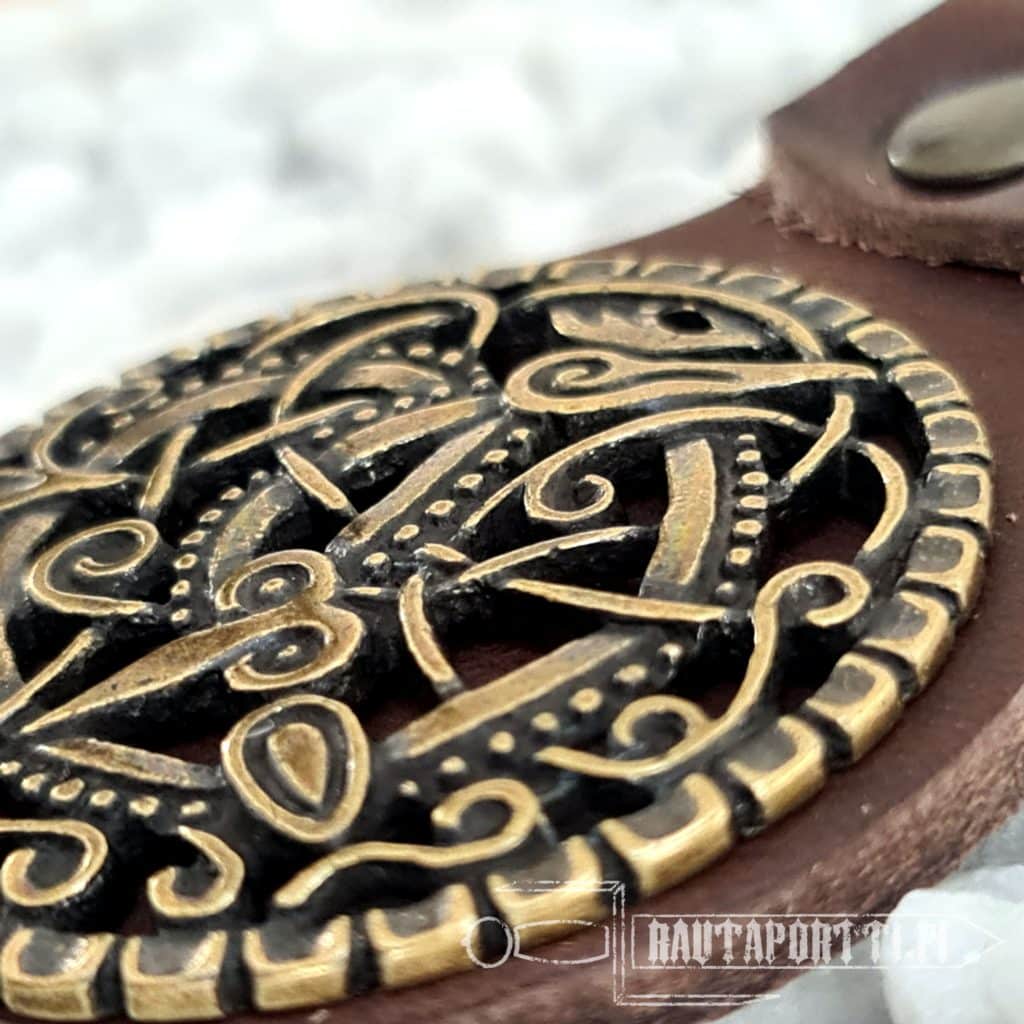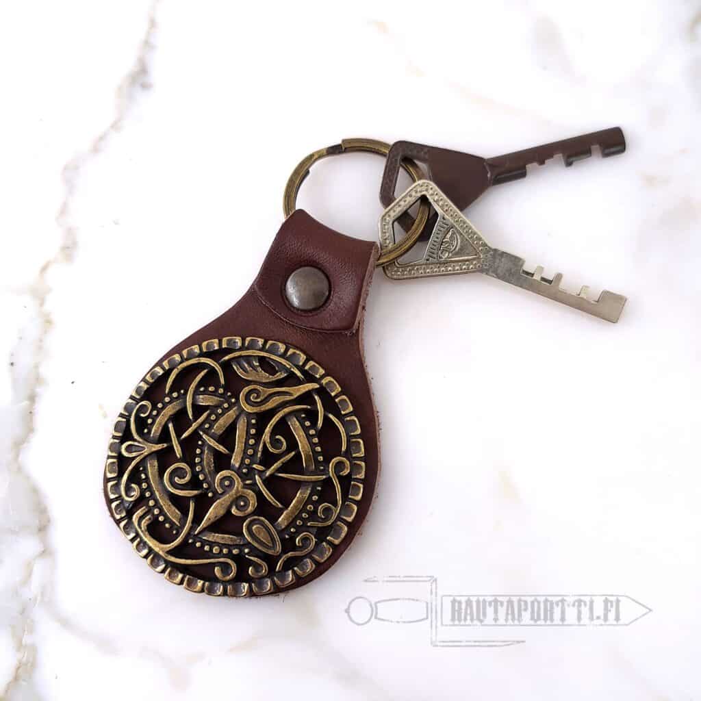 This Key Ring Holder is based on an early medieval age finding of a “Pitney Brooch” found in the churchyard at Pitney, England. It depicts a fierce battle between two creatures. A snake-like creature is biting a neck of a four-legged animal.