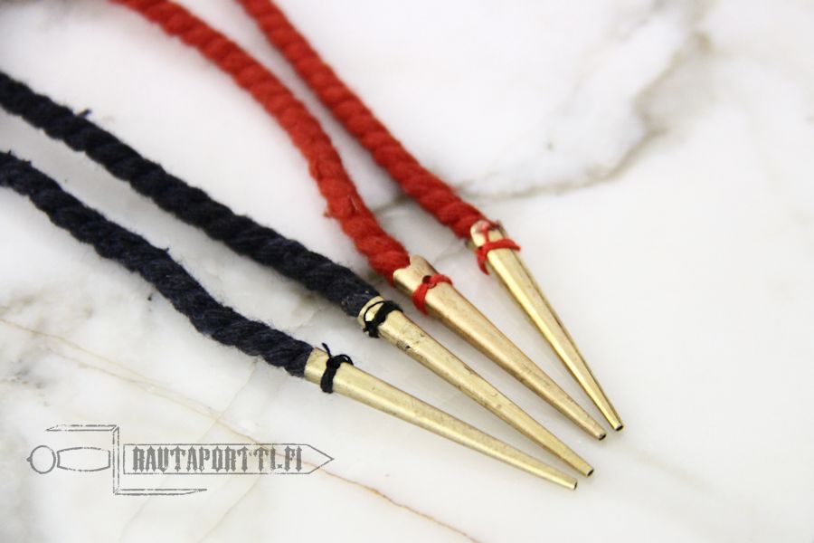 Made of cotton with brass chape on each tip. Waxing the laces increases their durability considerably.