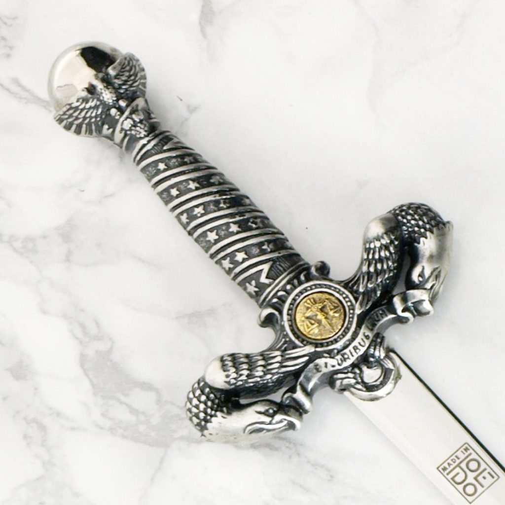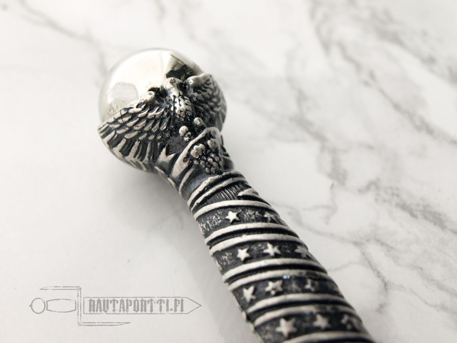 The pommel is a globe held aloft by an eagle with wings spread. The grip has the stars and stripes of the American flag. The quillons are fashioned with two American eagles joined together by a ribbon inscibed with the U.S. motto “E Pluribus Unum” (Out of Many, One). The center piece of the guard features the Scales of Justice.