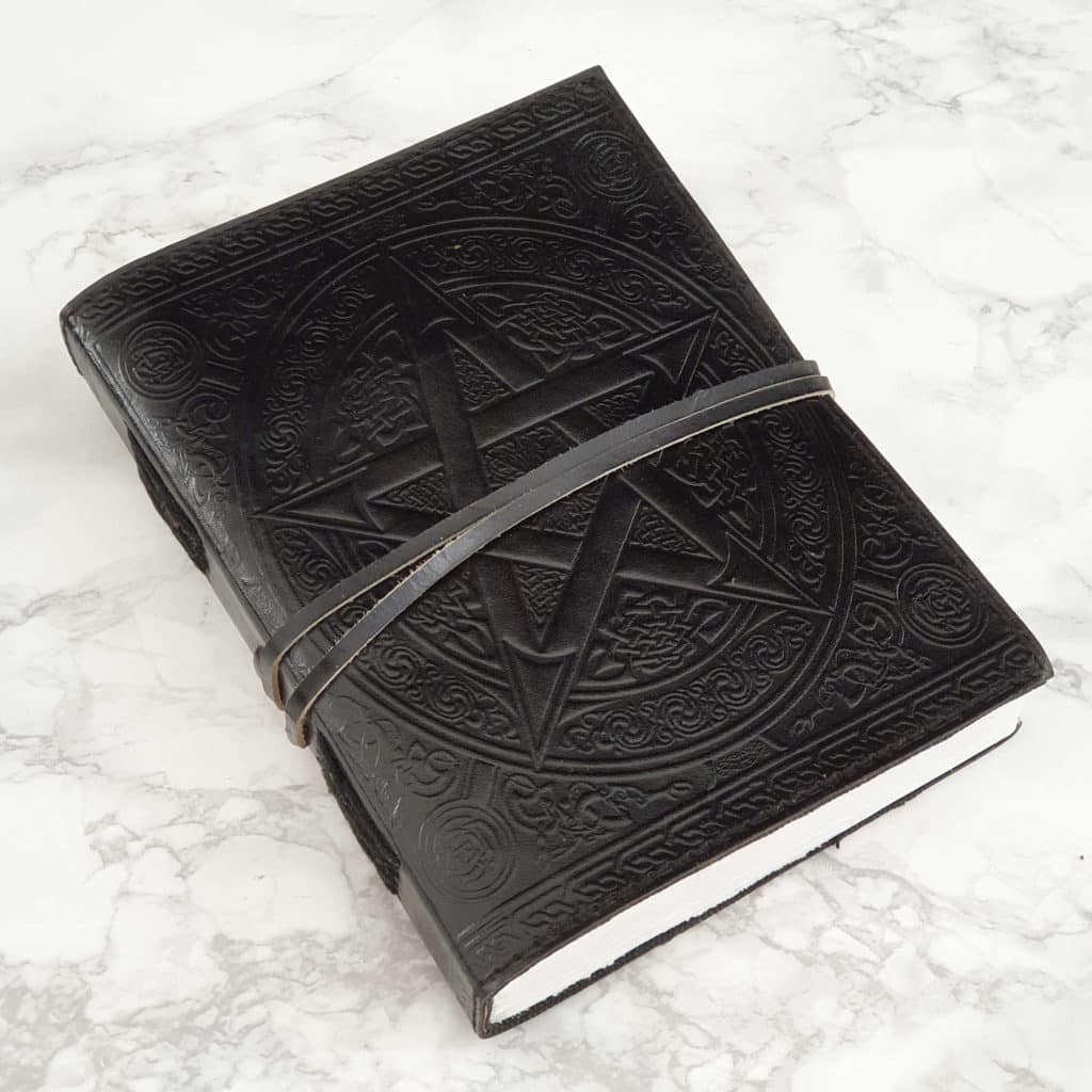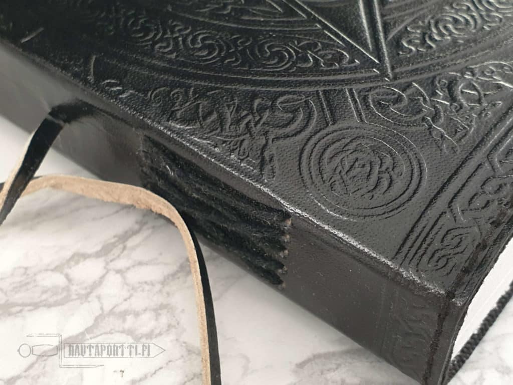 - This book can be closed and tied using a leather strap