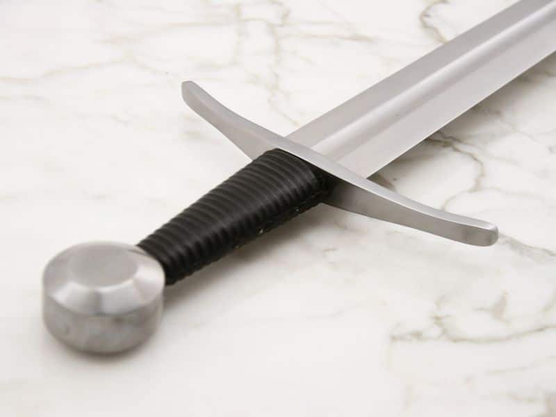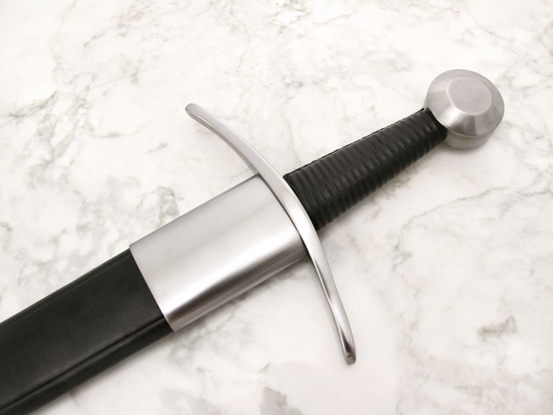 The hand forged blade of carbon steel tapers to a good firm stabbing point whilst retaining enough width for damaging cuts along its full length. Its tapered shape and long fuller make it relatively lightweight for its length. The blade is tempered to a very tough spring. This late medieval one-handed sword has a full tang that is riveted at the top of the heavy wheel pommel. The somewhat small radius of the wheel pommel makes up its weight by being over 3cm (fully 1-1/4″) thick. The stout cross-guard is not overly long and is curved to protect the hand from an opponent’s sliding blade. The hardwood grip is wrapped with slightly fluted leather.
