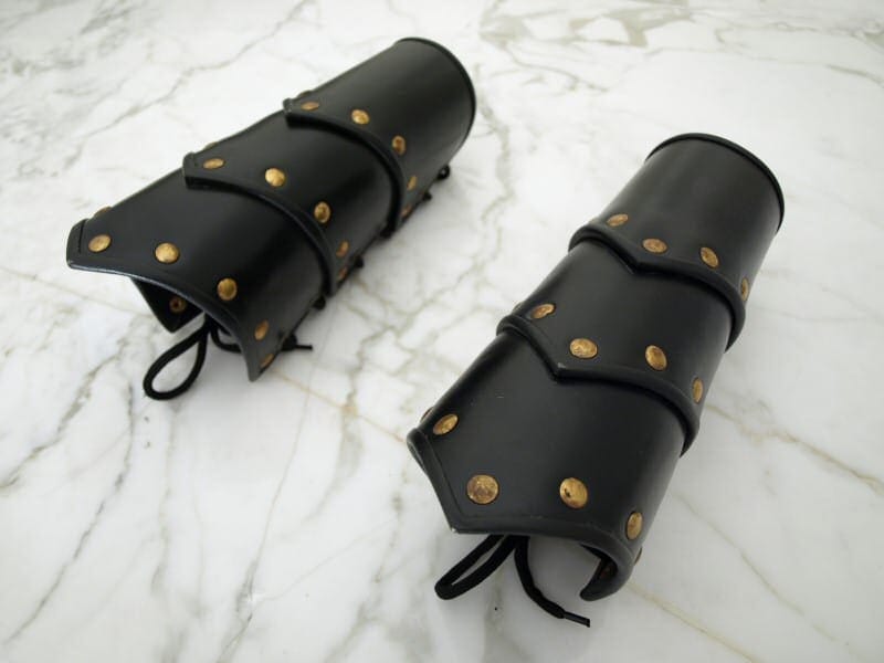 These beautiful vambraces are made from heavy grade leather and though thick, are easy and comfortable to wear all day long. Good for a large variety of outfits, from Roman soldier to medieval adventurer to fantasy outfits. They are sufficient for soft fencing, and as a light protection in wood and steel fencing. These vambraces are also great for use with your bow. Heavy grade leather has been a popular material in armory throughout the times as it gives excellent protection against slashes as well as against crushing blows. Includes two vambraces.