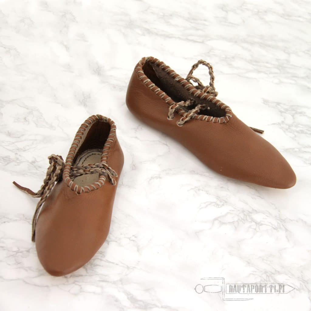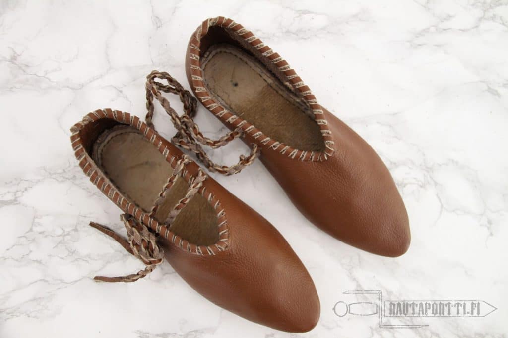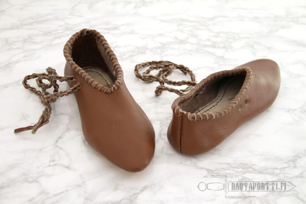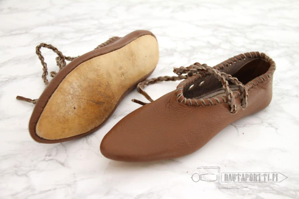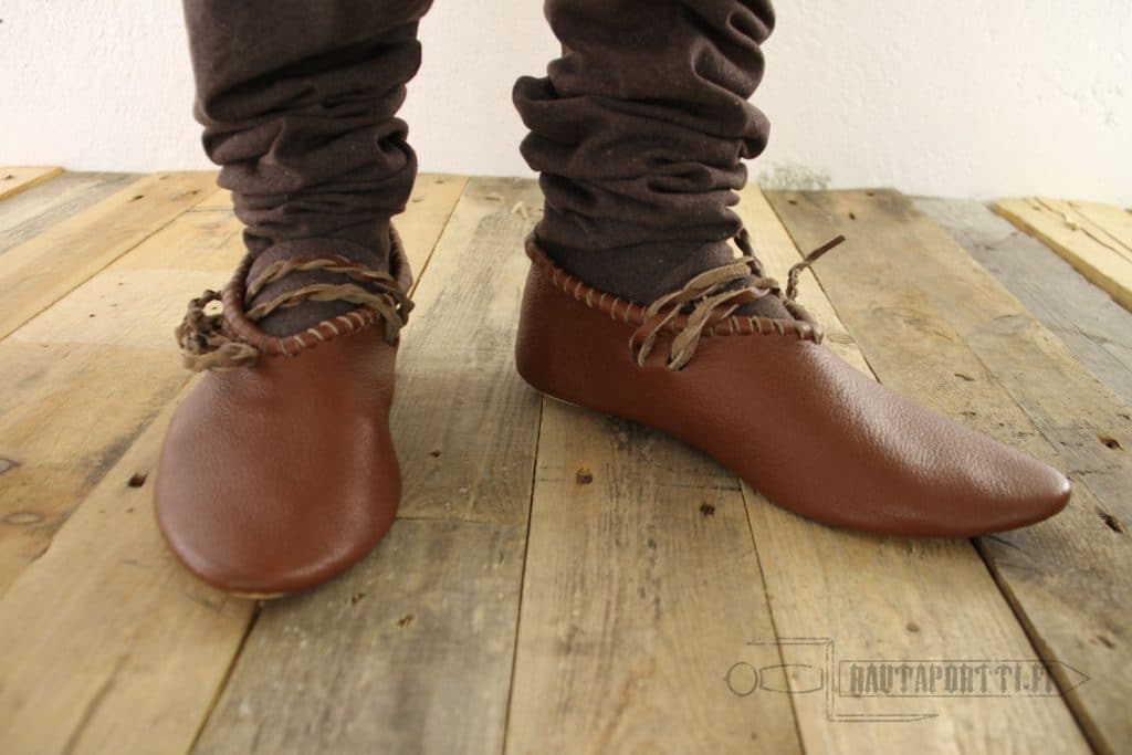 This is a light, flexible and comfortable shoe, which would normally be used with wooden shingles or to be used indoors. It lacks a rigid sole. Due to its simple construction, slippers like these were commonly used all the way from the iron age to the modern era.