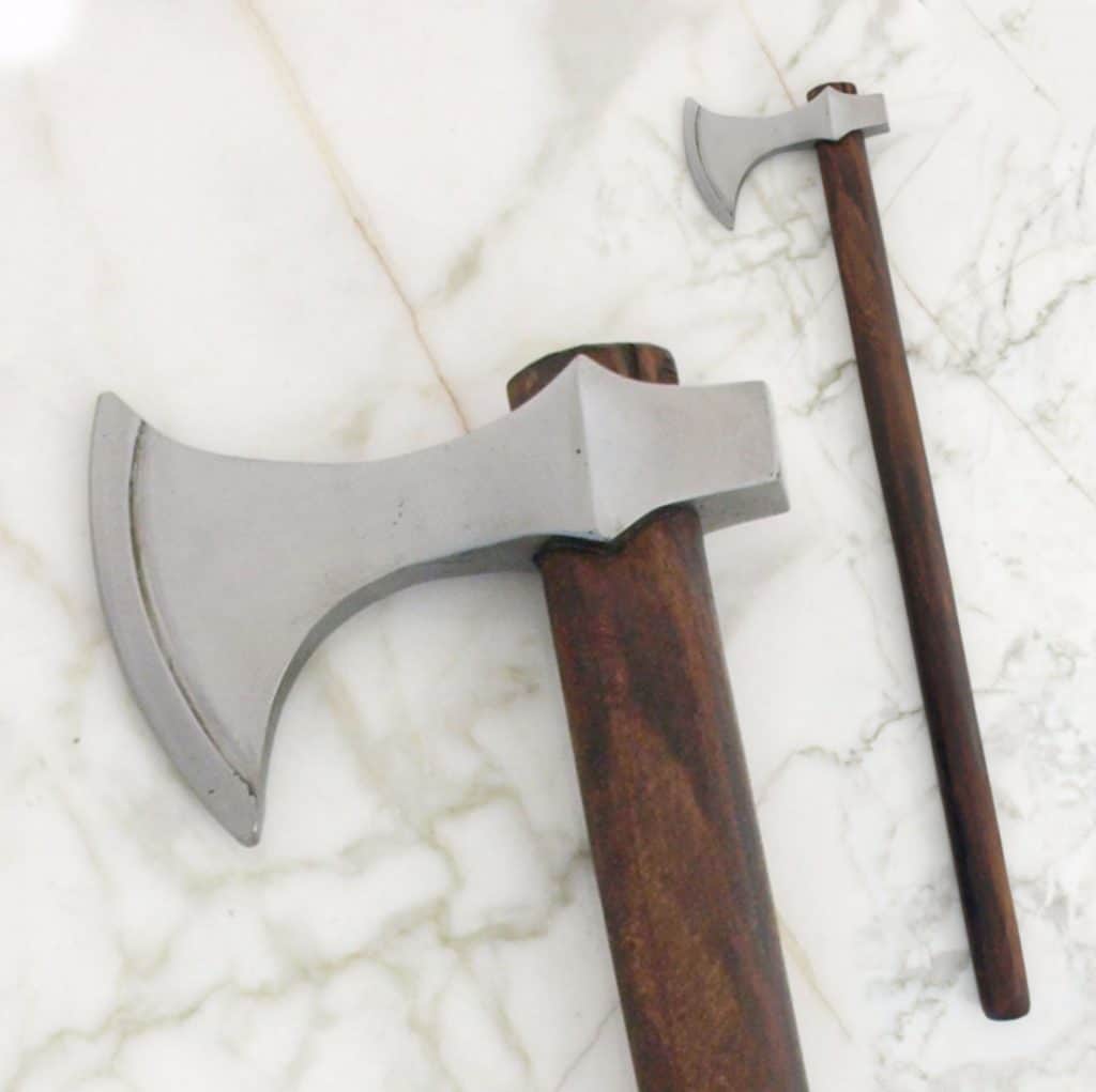 Typically viking warriors would carry a shield for protection, and arm themselves with either a spear or an axe, leaving the expensive sword for the rich. Making an axe didn’t require large amounts of expensive and scarce metals, which made the axe a popular weapon. An axe like this could be used in battle, but had other more general uses too, such as chopping wood. The vikings appreciated its practicality. If battle ensued, an axe such as this could be used as a throwing weapon, and in close combat it was versatile, fast and deadly.