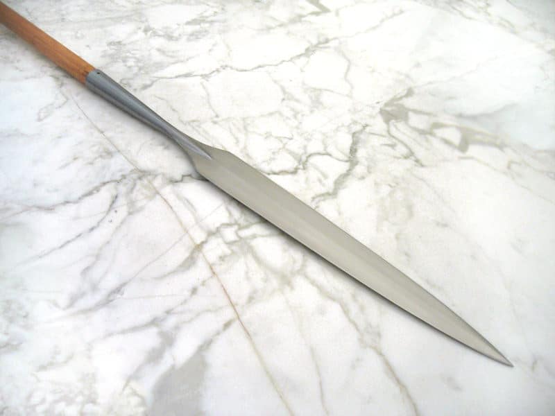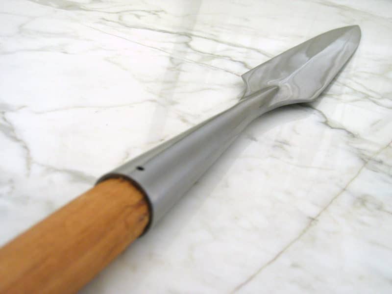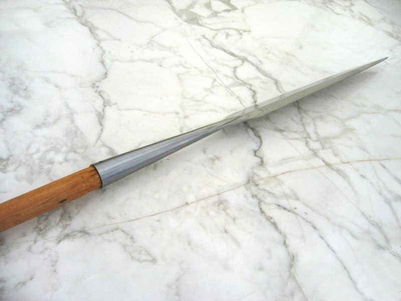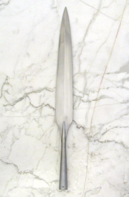 Although we do not know the exact form and shape of the Viking hewing spear, we do know that they were used. Hank Reinhardt designed this spear based on his own experience. This is a spear that would thrust effectively, and yet have the power to cut decisively. High carbon steel blade. Slim and attractive, it is just the spear to carry on your next medieval outing. Pole not included. Fits in a 30mm (1 1/5”) diameter shaft.