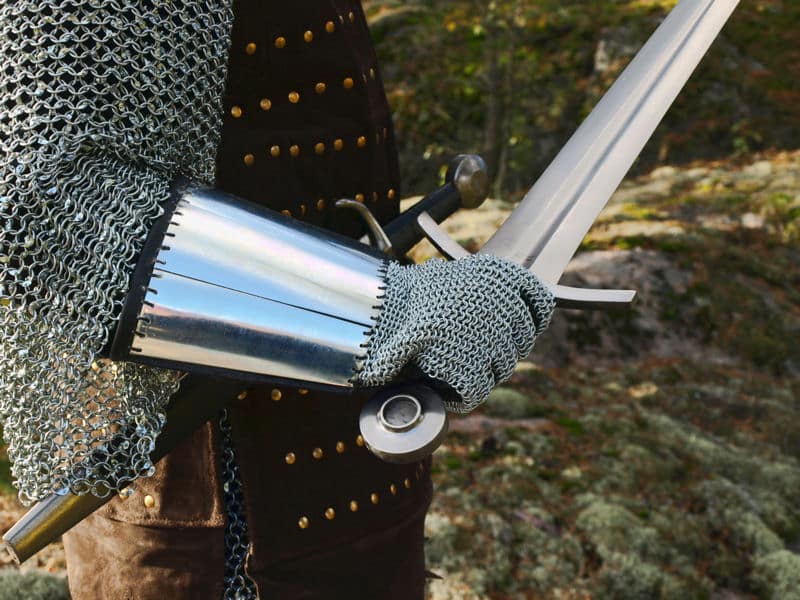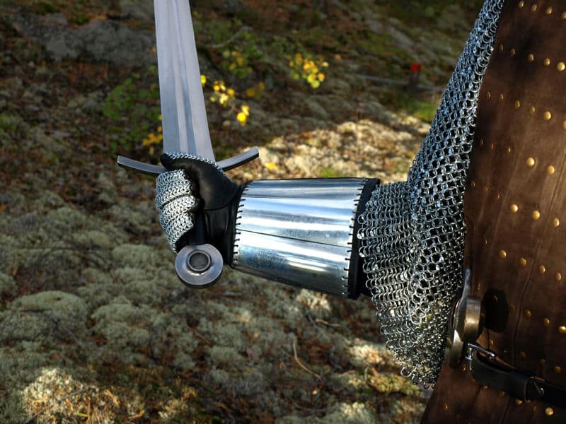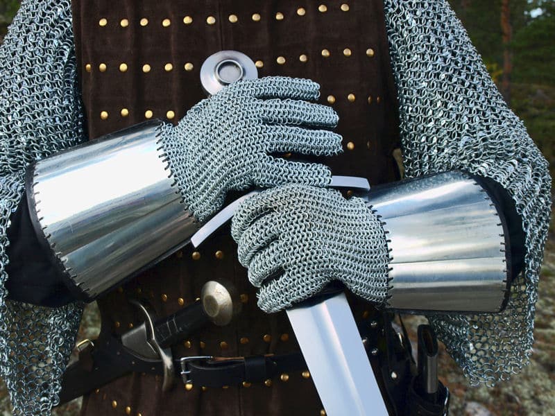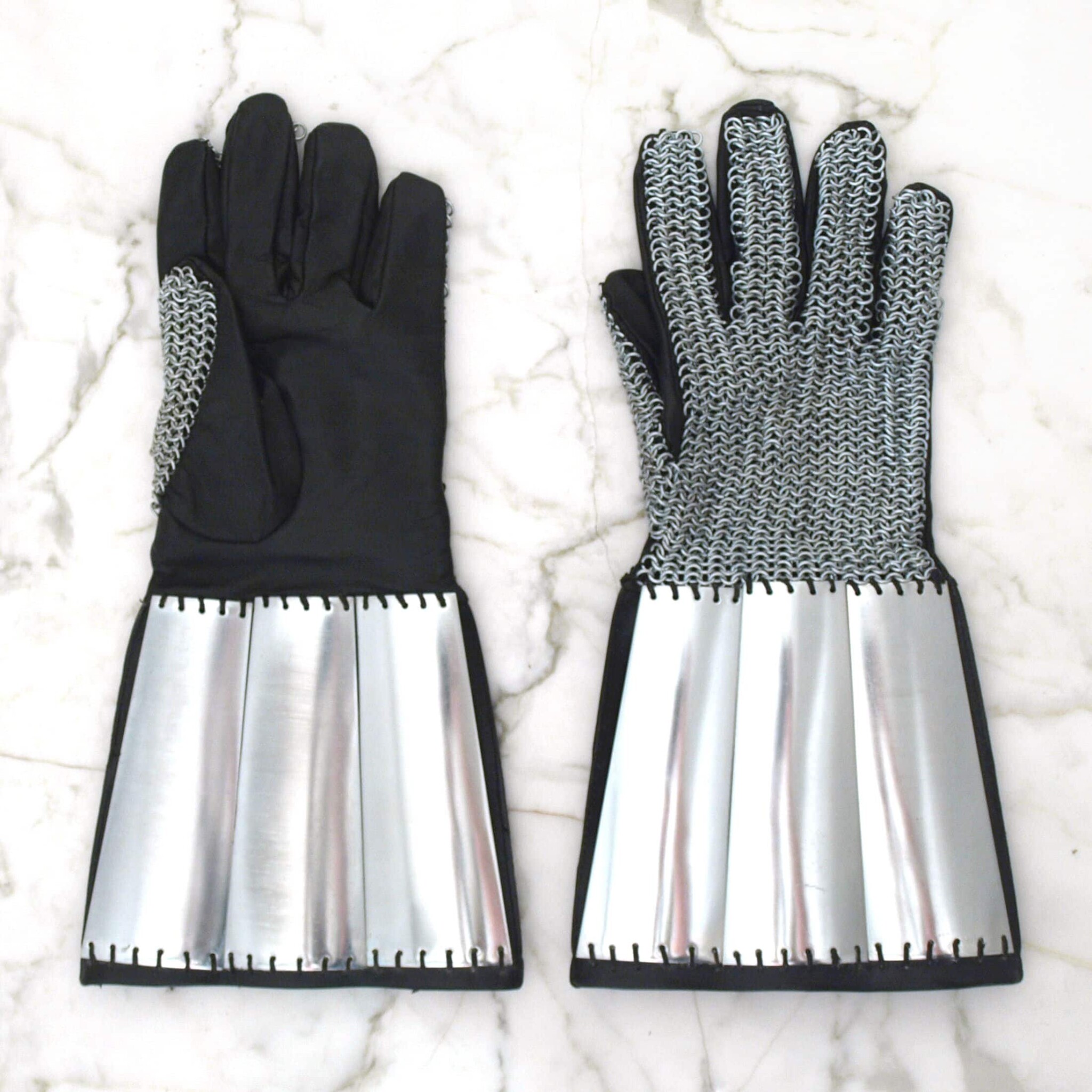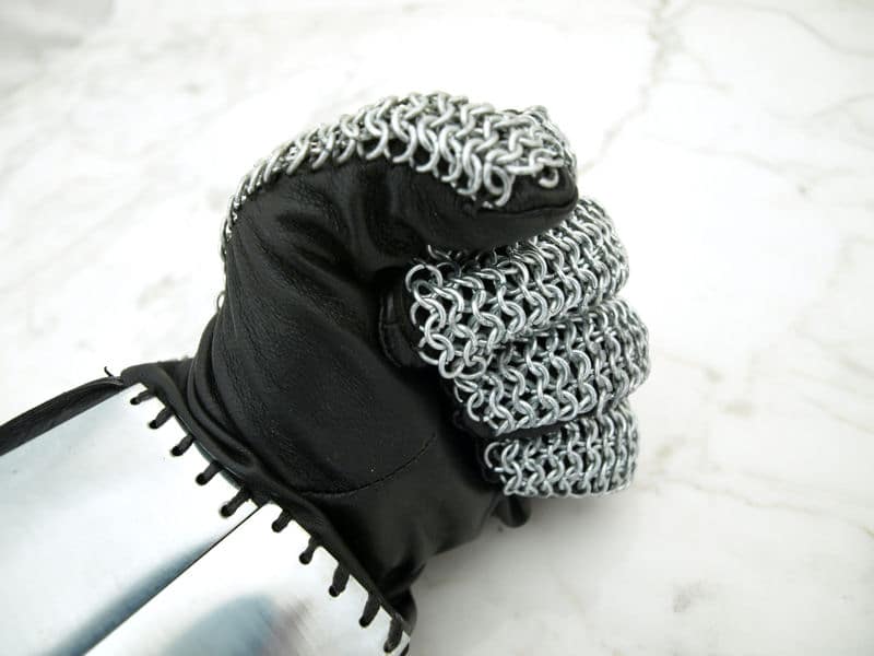 To protect the back of the hand, we have added mail on our black leather gauntlets and also placed slightly cupped steel lames all around the cuff. These gauntlets offer good protection to the hand, wrist and lower arm from a sword slash or draw cut. There’s a pair much like these at the Art Institute of Chicago that are highly decorative, however we have left ours plain to keep the price down and to allow them to be historically correct from the Early Middle Ages well into the Renaissance. These mail gauntlets are a must for any enthusiast.