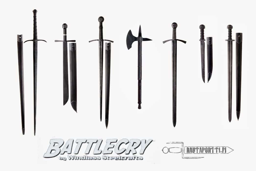 The Battlecry line of historical swords, daggers and axes has been designed in conjunction with John Clements, whose knowledge of historical fencing and Medieval and Renaissance fighting methods is unsurpassed. Hand forged by Windlass Steelcrafts, the 1065 high carbon steel is tempered in computer controlled ovens to a hardness of low 50’s RC. This ensures strength, resiliency and edge retention. Swords have extra wide full tangs and all weapons are sharpened.