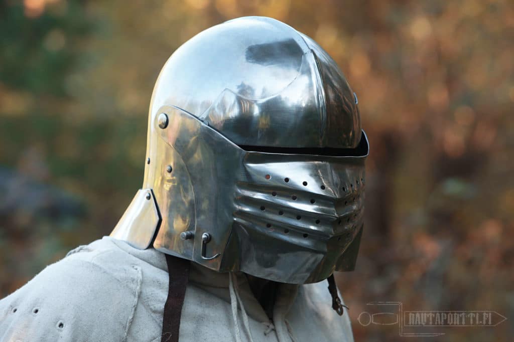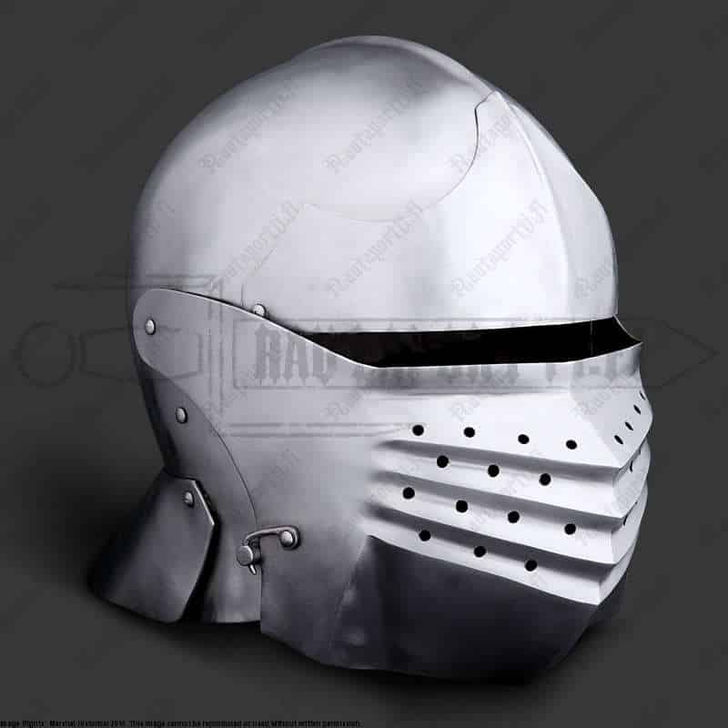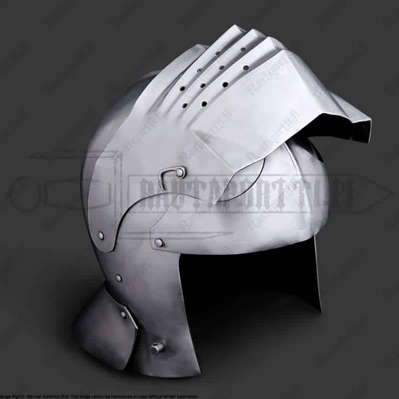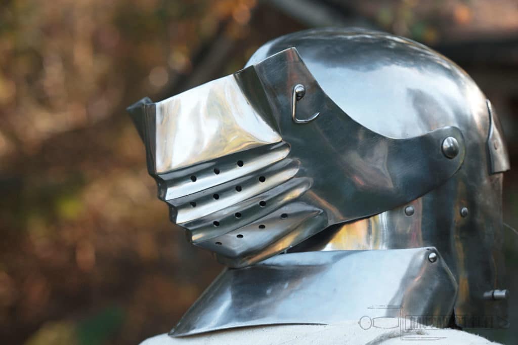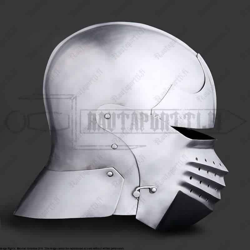 Near the end of 15th century sallets began a transformation into the shapes known as “transitional sallets”. The sallet transitioned from a helmet covering the top of the head and upper face into a fully closed helmet protecting the whole face, jaw and throat. The evolution ended up in 16th century close helmets, armets and burgonets.