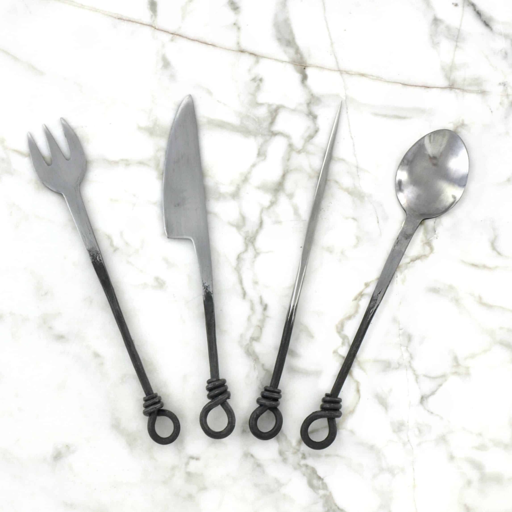 All items are hand-forged out of stainless steel and suitable to use even in our modern times. We recommend that you clean them thoroughly prior to first use. The four items of this set may be easily tied together with a leather strap (comes with the set) and carried for example on your belt. Length of utensils: approx. 22 cm.
