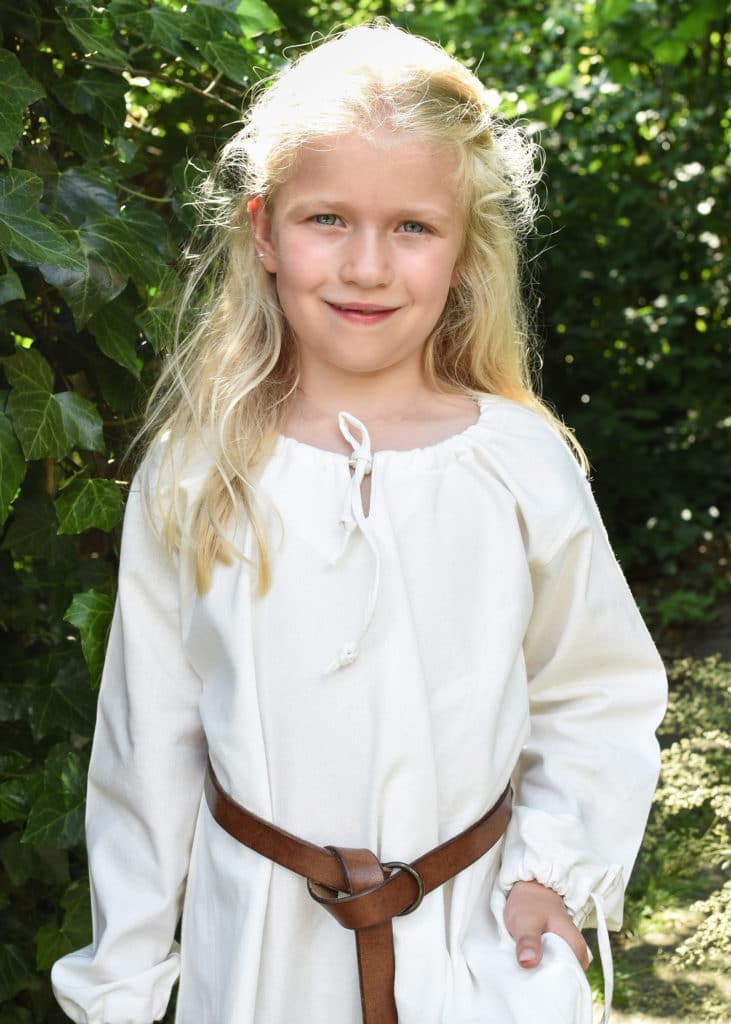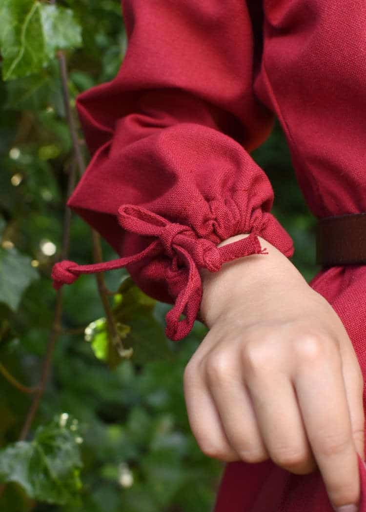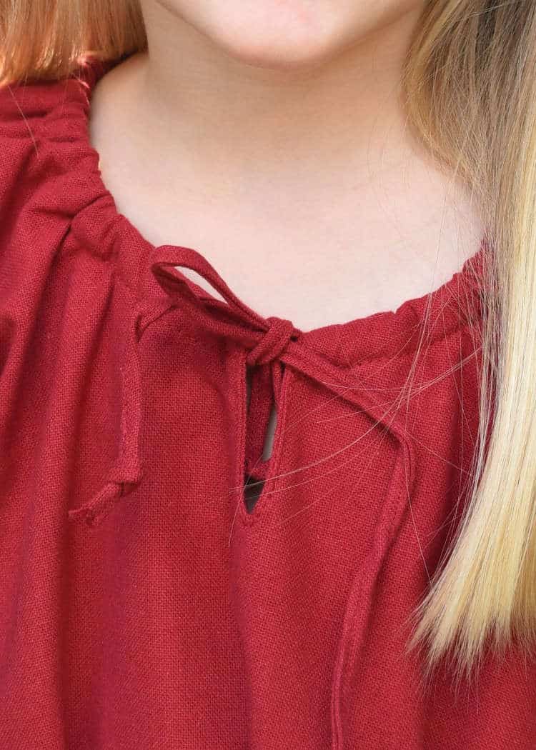The gathered neckline is based on an rare archaeological textile fragment found in Pskov, Russia, and believed to have belonged to a 10th century Viking dress. It has a slit on the front and can be closed with ties. The cuffs of this dress are also equipped with ties so you can create gathered sleeves, wear sleeves open and wide or even tie sleeves at elbows during the hot summer days.