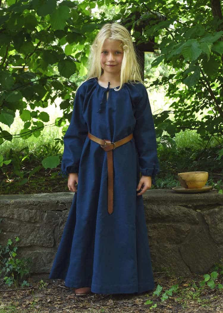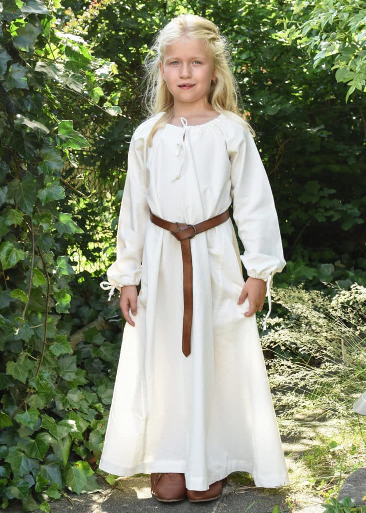 The dress is made from plain, yet thick and durable cotton fabric and can be worn either as a shift or as an outer garment. As a plain dress this is a very versatile piece of clothing that suits many characters. For example when combined with a coif and an apron or surcoat, this dress is ideal for the portrayal of a maidservant.