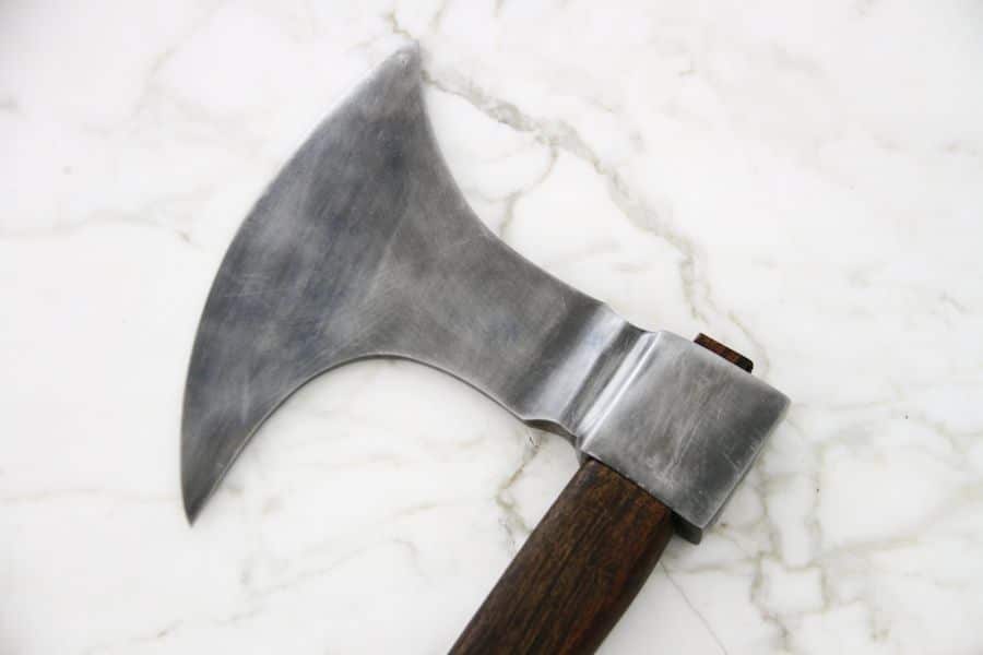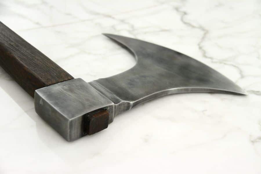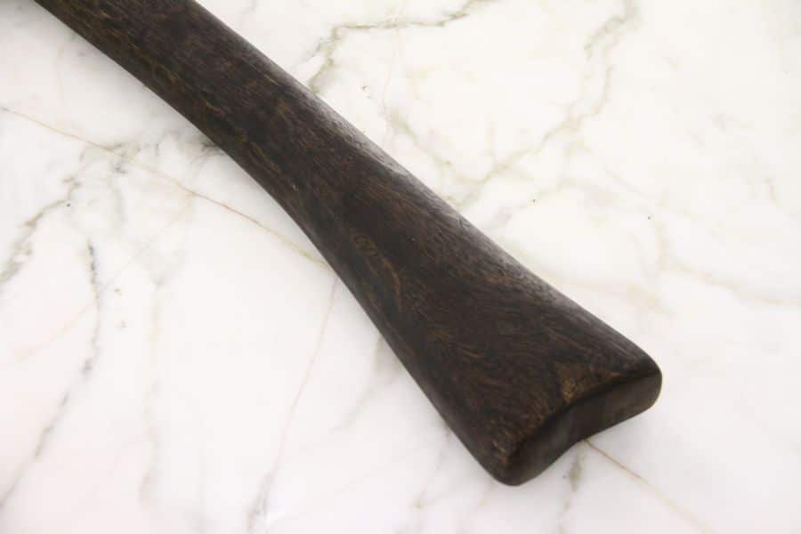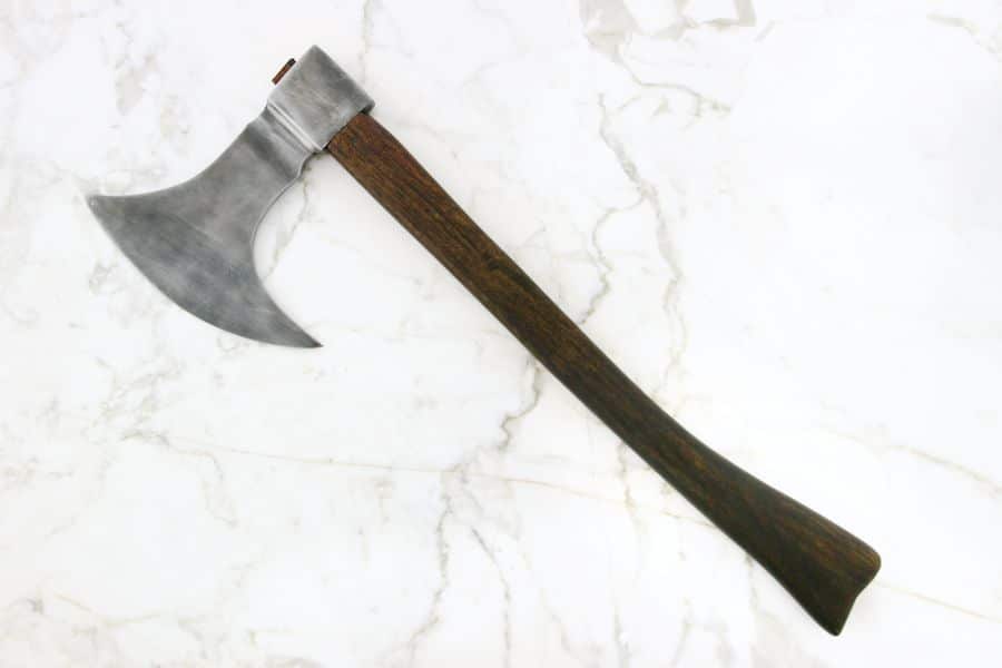 This intimidating and deadly hunters axe has a thick wooden shaft which further widens towards the end. This ensures the axe won’t slip out of the hunters hand even when swung from horseback. The imposing steel axe head securely grips the hardwood shaft. Axes such as this could be used in many hunting related activities, such as chopping the carcass, removing the hide, and was sturdy enough to cut bone as well. The hunters axe was also useful if some clearing work needed to be done whilst out on the hunt.