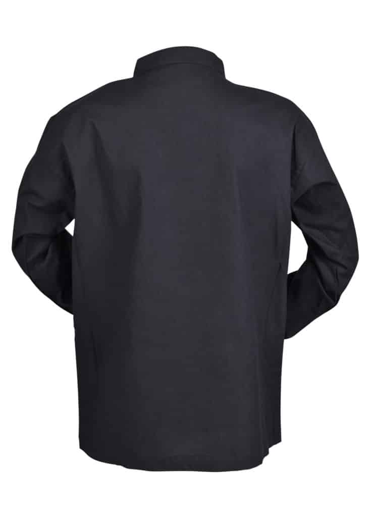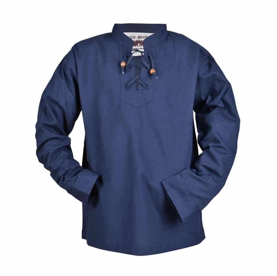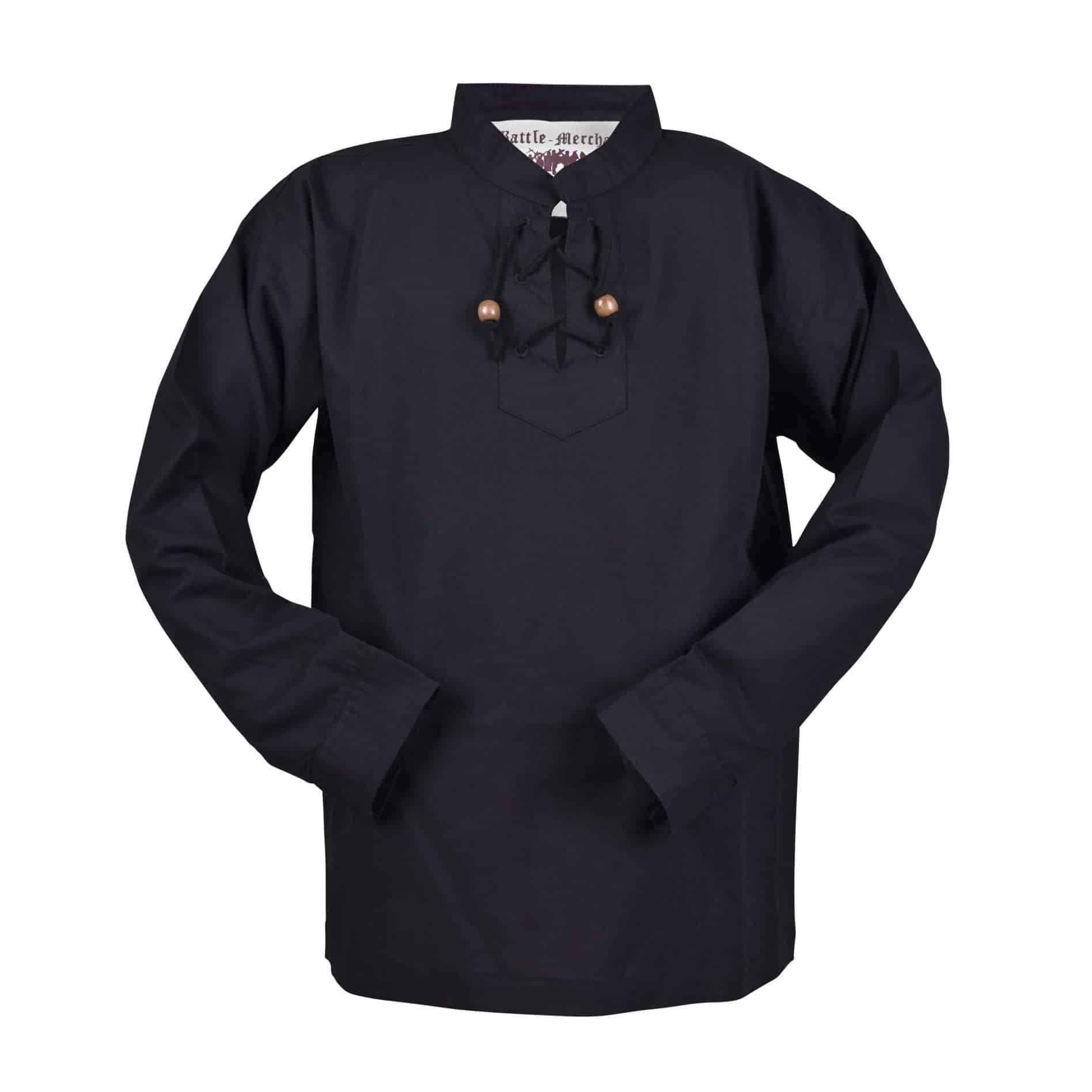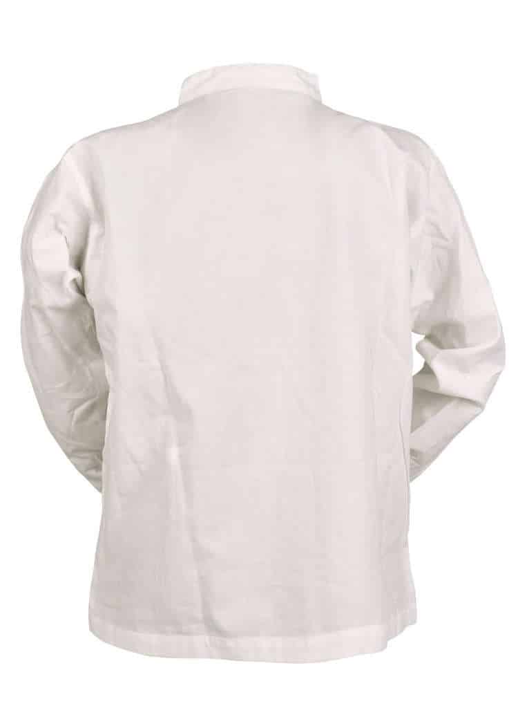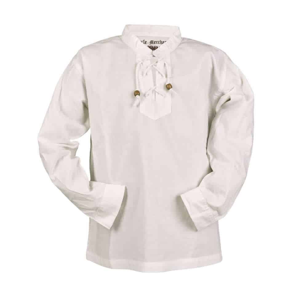 The shirt is made of fine cotton and has a comfortable fit. The stand-up collar has an adjustable lacing at the neckline. Wooden beans at the end of the laces.