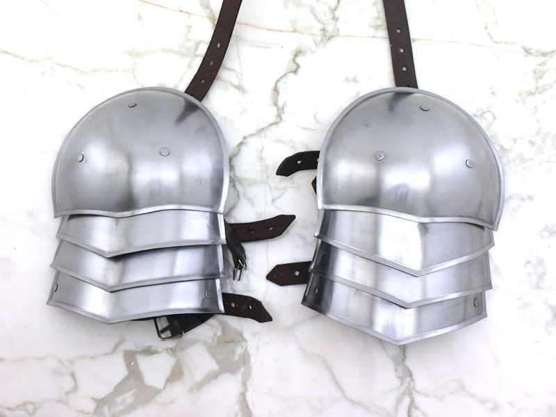 Spaulders were added onto mail for extra protection early 14th century and usage continued as long as plate armour was used. This plain model consists of four parts. The parts are able to move separately and the spaulder doesn’t affect or hinder arm movements. Spaulder is attached to the arm with two sturdy leather straps and a third strap is attached on top of the spaulder to stop it sliding down. The third strap is either sewn, tied or even riveted to your gambeson, mail or plate armour (bevor or breast plate) to keep the spaulder up. Comes with 3 mm thick leather straps. Package includes two spaulders.