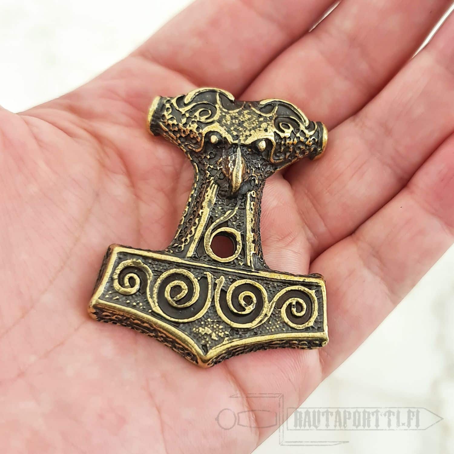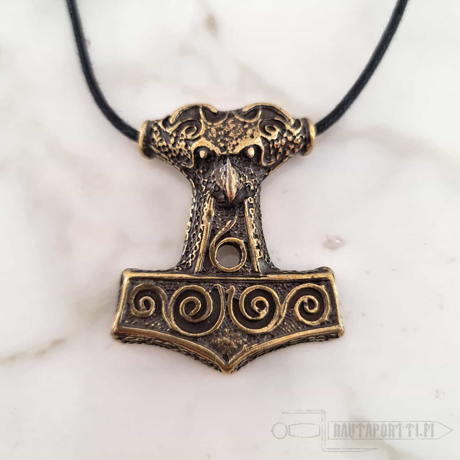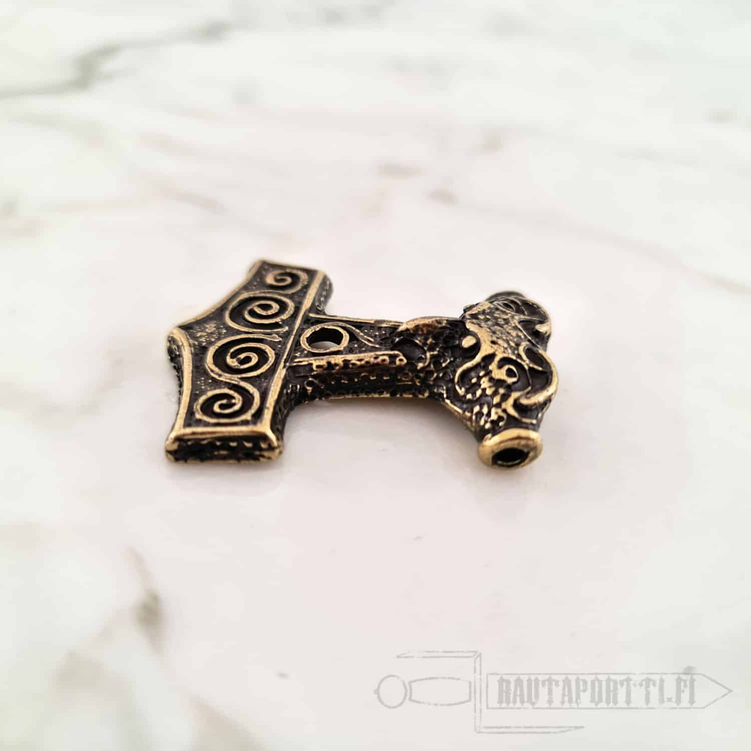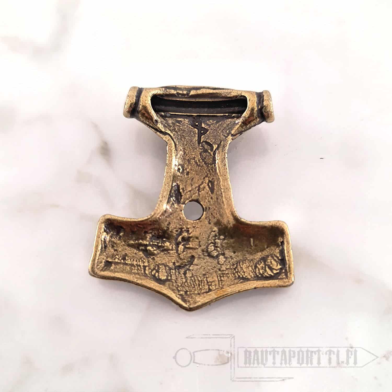 This specific hammer is based on one of the finest and most famous Viking Era pendants. The original 10th century pendant was found from Skåne, Sweden. Made of zamak with brass color.