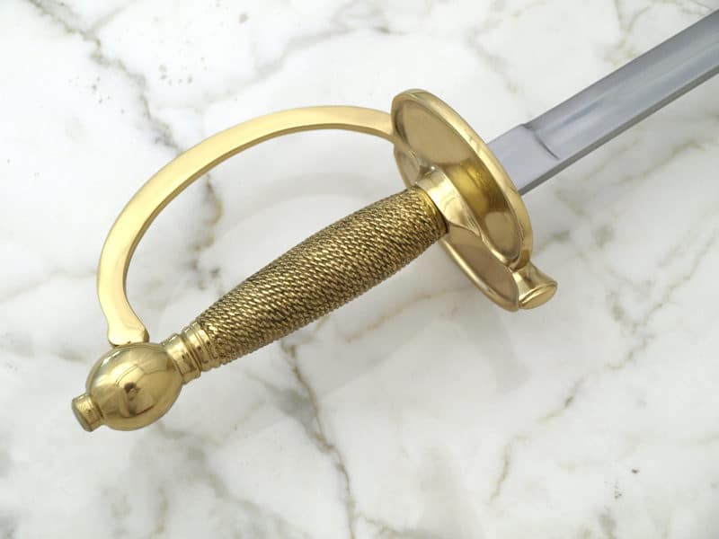 The single-edged blade has a broad fuller starting from the ricasso, and ending near the point. The entire hilt is cast brass and the grip is ribbed. Pommel is global with a capstan. Grip is flanked by kidney-shaped hand guards The 1840 NCO sword comes with a steel scabbard.