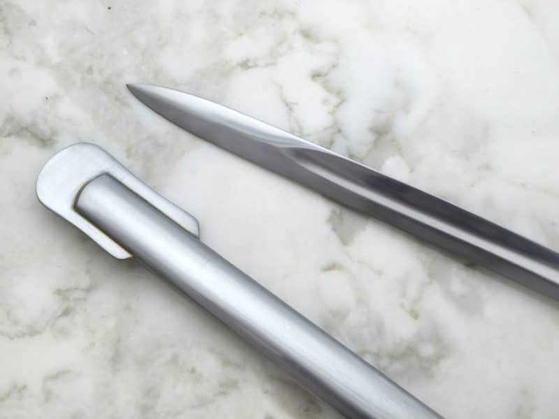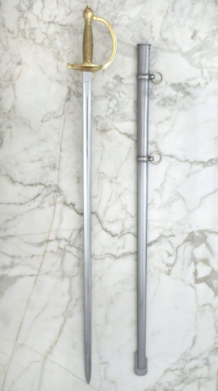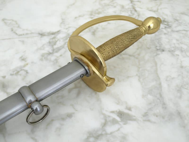 Historical sword carried by American soldiers for over 70 years Includes steel scabbard with two rings for hanging Overall length: 96 cm Weight: 0.82 kg Blade material: 1065 High Carbon steel Handle material: Brass wire wrapped hard wood Sharpness: Unsharpened