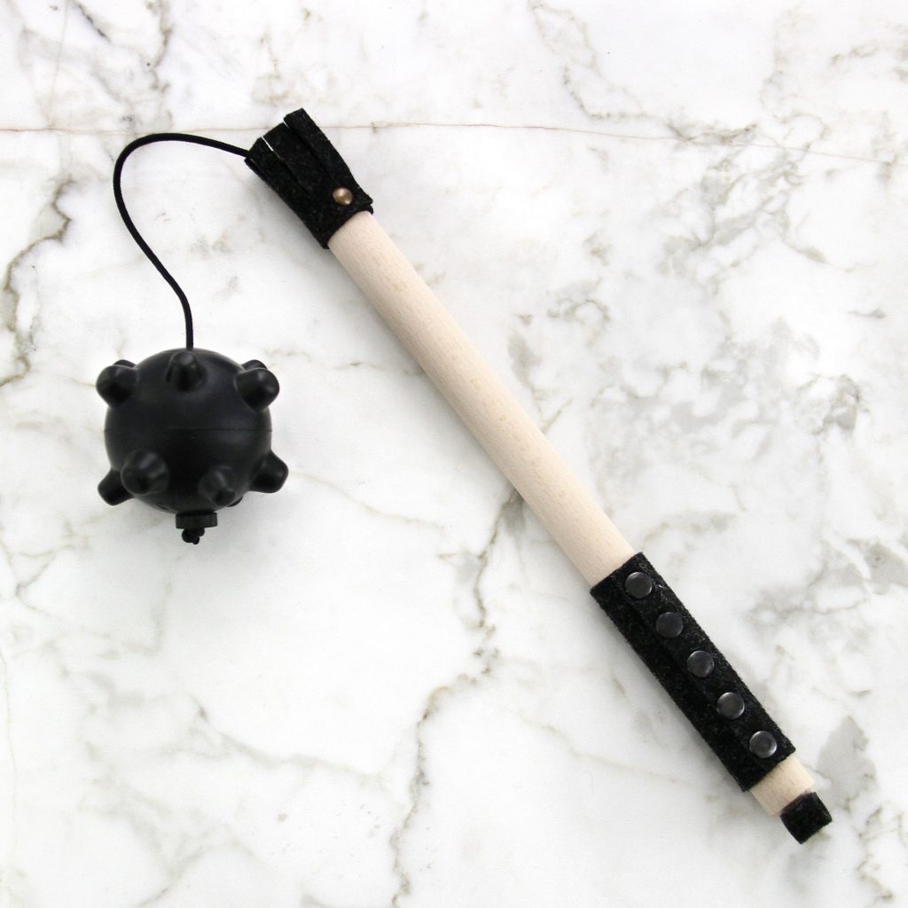 The morning star is the most fierce looking weapon possible, and inspires the imaginations of both adults and children. A real morning star is lethal, but this safe foam ball version makes it possible for the kids to be fully immersed in knightly escapades without inflicting grievous bodily harm. The wooden handle has a soft felt grip decorated with metal studs.