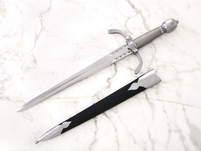 The dagger has two fullers with decorative holes running the entire length of the ricasso. This ornamental device makes the Munich Town Watch dagger exciting and lighter at the same time. The grip is made of wood and elaborately wrapped with steel wire and has decorative braided wire at both ends. A riveted pommel shaped like a flattened ball completes the hilt of this Munich Town Watch dagger. It comes with a matching scabbard made of leather. The original dagger is from around 1600.