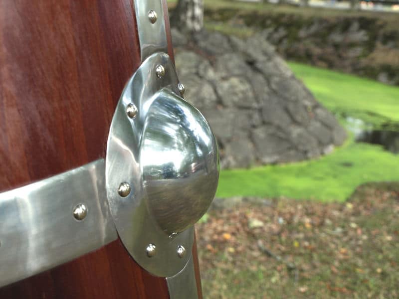 This Norman Shield is made of varnished wood, with a steel boss and a riveted cross made from steel. The shield has 5 leather straps for different carrying styles. Using the long strap you can carry the shield on your back when not in combat.