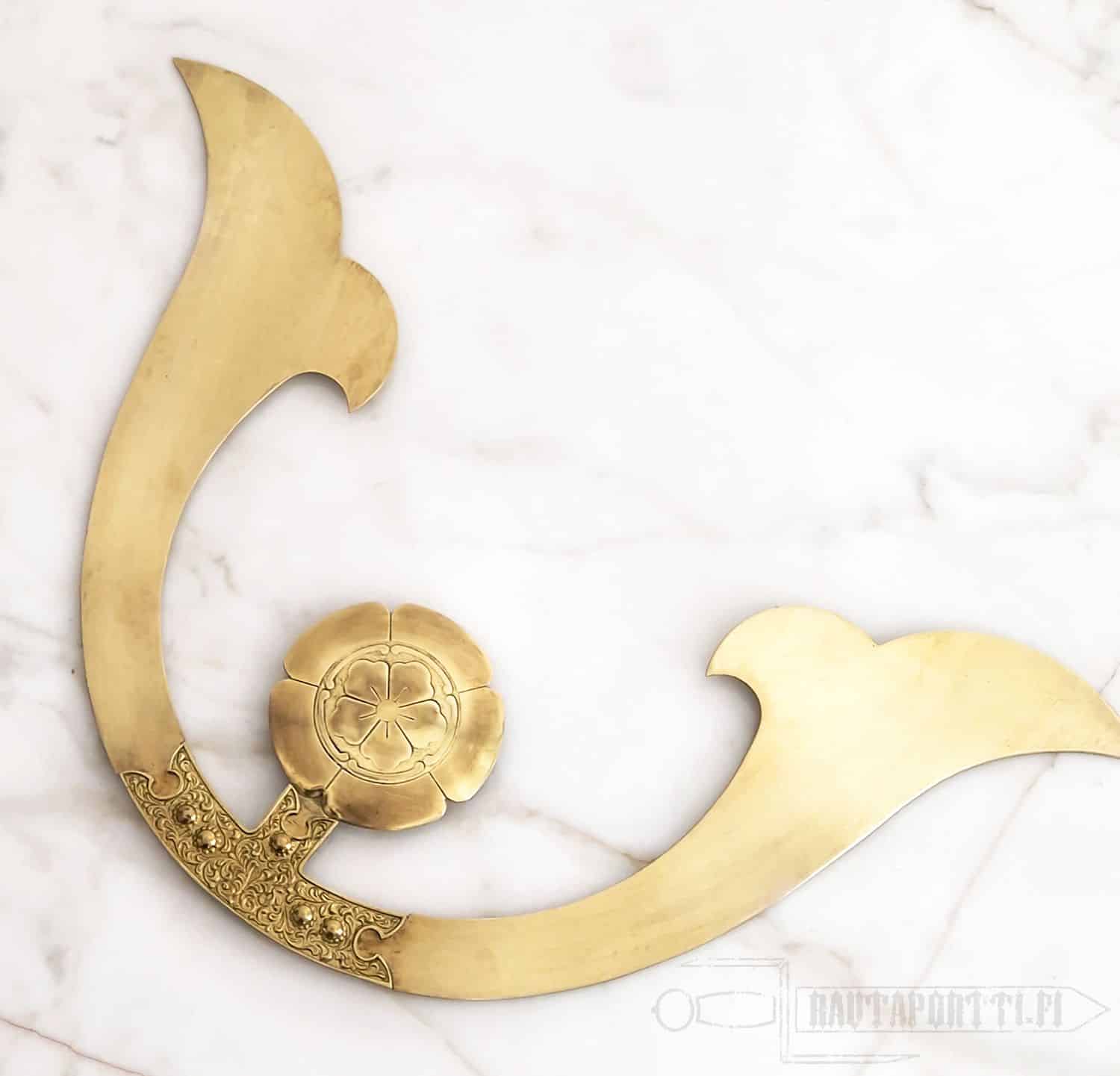 Menpo face guard, complete with a genuine horse hair mustache is removable separate piece and is attached to the helmet by knotting it into position with the thick helmet cords. The nose and moustache parts of the menpo can be removed to leave only the cheek and chin armor. Oda Nobunaga’s bold and large crest is made of gleaming brass, is also removable. The helmet comes with a custom wooden display stand for showcasing.