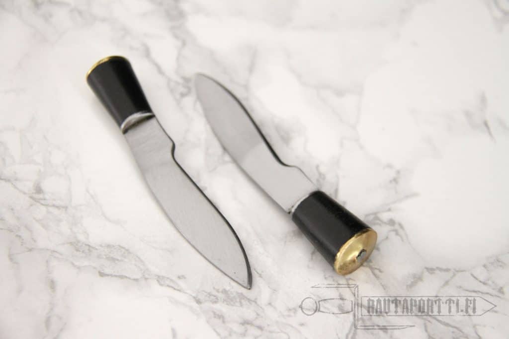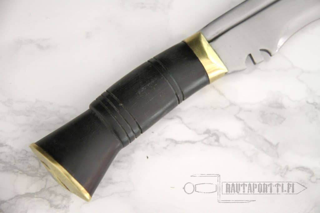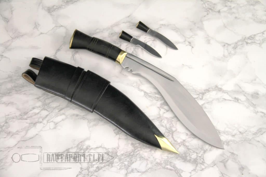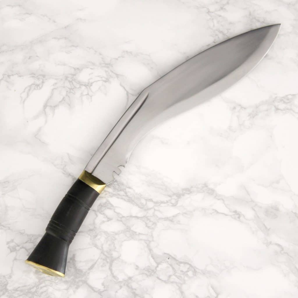 Used with devastating effectiveness by the famous Nepalese Gurkhas in the Siege of Delhi in 1857, in the trenches of WWI France, throughout the New Guinea jungle in WWII, and with distinction in the Falkland Islands. Takes a good, sharp edge. Scale tang. The contoured handle is made of authentic buffalo horn. Brass knob and reinforcement. Genuine military issue to the officers in the Gurkha Regiments in India. This officer’s Kukri is slightly smaller than the regimental version. The Gurkha officers kukri comes with the official sheath and two accessory knives. There might be slight variation in the size and blade shape of these small accessory knives. The other accessory knife has traditionally been left blunt, to be used for example as a fire steel, and the other one is sharper, to be used for example in skinning, eating or other small tasks.