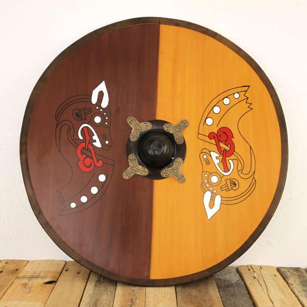 This shield has a painted animal motif. Animals featured in most, if not all, Viking art for three centuries. Zoomorphic art is abstract, so it is often impossible to tell which animal is pictured. These intermeshed and convoluted animal elements are found not only in Scandinavian art, but are also prevalent in Germanic and Celtic areas, such as Anglo-Saxon England.